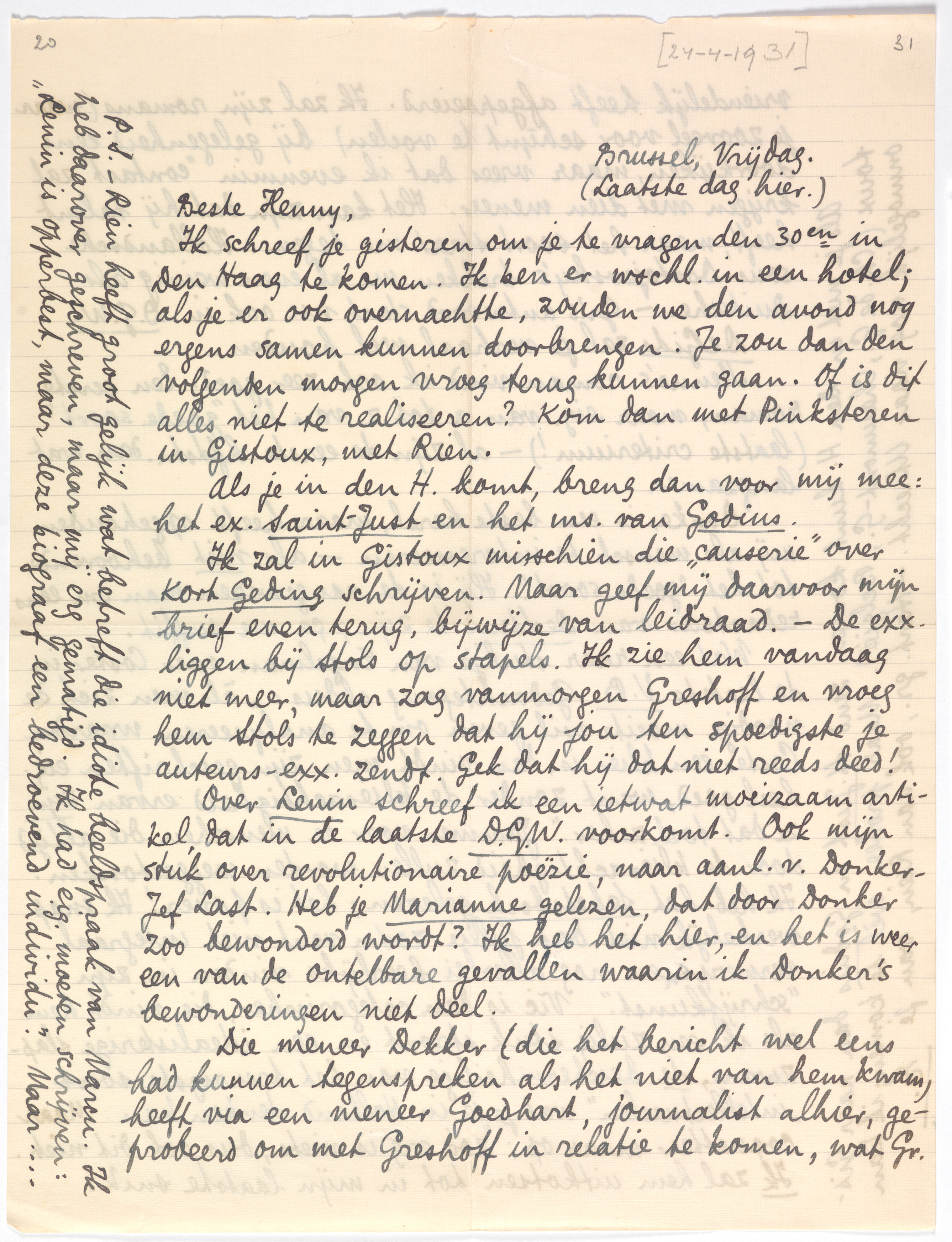Als je niet in Den H. kunt komen, zend St. Just en Godius dan naar Gistoux (Ch. de G., Chaumont-G., België). Maar probeer wèl te komen; ik kan onmogelijk nog naar Utrecht. - Hart. gr., ook aan Rien, van je