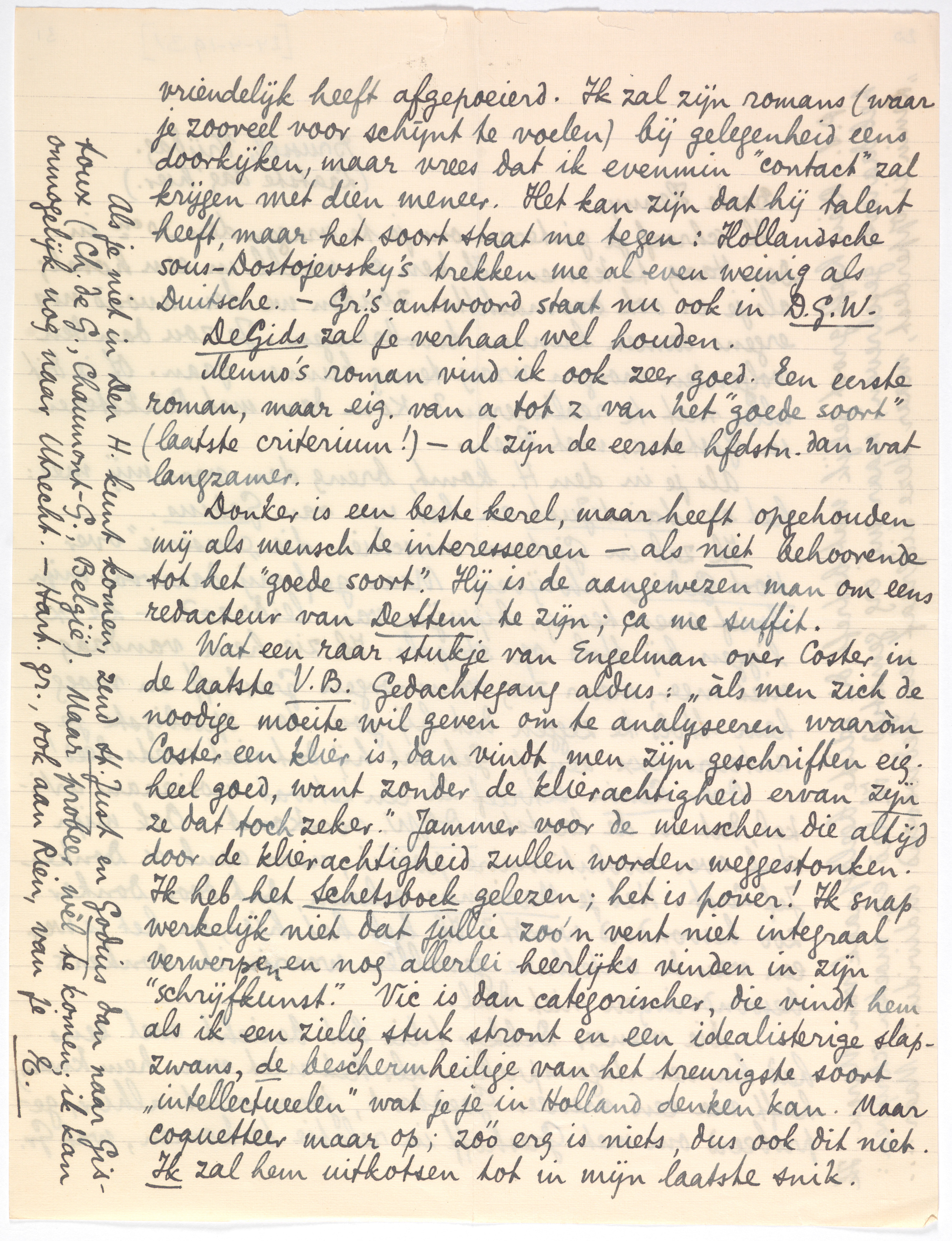 Wat een raar stukje van Engelman over Coster in de laatste V.B.1743 Gedachtegang aldus: ‘àls men zich de noodige moeite wil geven om te analyseeren waaròm Coster een klier is, dan vindt men zijn geschriften eig. heel goed, want zonder de klierachtigheid ervan zijn ze dat toch zeker’. Jammer voor de menschen die altijd door de klierachtigheid zullen worden weggestonken. Ik heb het Schetsboek gelezen; het is pover! Ik snap werkelijk niet dat jullie zoo'n vent niet integraal verwerpen en nog allerlei heerlijks vinden in zijn ‘schrijfkunst.’ Vic is dan categorischer, die vindt hem als ik een zielig stuk stront en een idealisterige slapzwans, de beschermheilige van het treurigste soort ‘intellectueelen’ wat je je in Holland denken kan. Maar coquetteer maar op; zóó erg is niets, dus ook dit niet. Ik zal hem uitkotsen tot in mijn laatste snik.