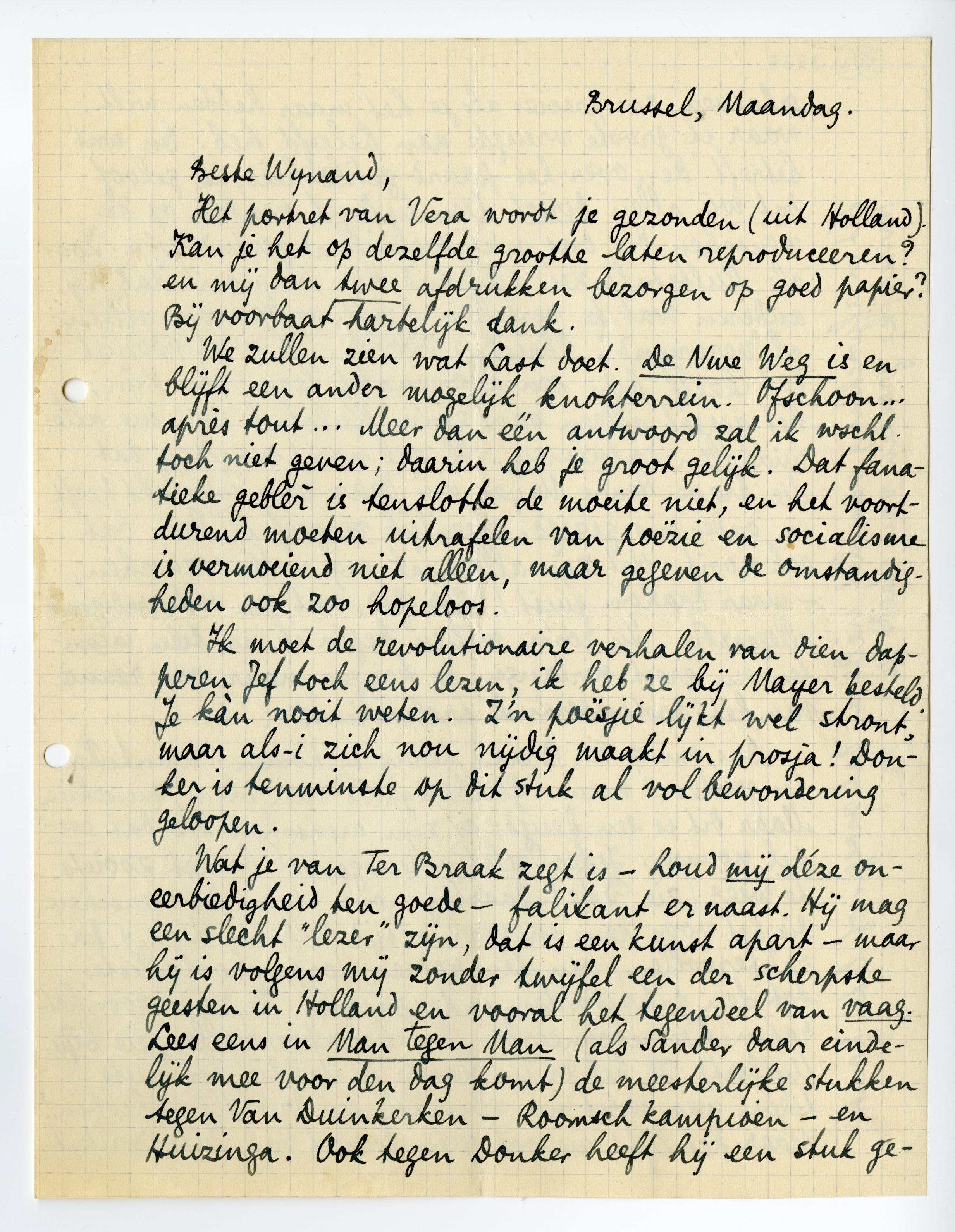Wat je van Ter Braak zegt is - houd mij déze oneerbiedigheid ten goede - falikant er naast. Hij mag een slecht ‘lezer’ zijn, dat is een kunst apart - maar hij is volgens mij zonder twijfel een der scherpste geesten in Holland en vooral het tegendeel van vaag. Lees eens in Man tegen Man (als Sander daar eindelijk mee voor den dag komt) de meesterlijke stukken tegen Van Duinkerken - Roomsch kampioen - en Huizinga.1746 Ook tegen Donker1747 heeft hij een stuk geschreven, zoo precies als je het maar hebben wilt, waar ik groote vreugde aan beleefd heb. En wat betreft de ‘over-het-paard-getild’-heid, ik geloof dat wij allen direct dien indruk maken op de menschen die ons niet welwillend gezind zijn. Zooals Multatuli zei: iemand die vermeent dat hij anderen wat te vertellen heeft, is daarom alleen al ‘verwaand’, Christus voorop. Ik weet vooruit dat ikzelf bijv. een abominabel ‘lezer’ zou zijn; het aspect alleen van zoo'n Kulclub1748 zou me alle middelen ontnemen. Ik zal nooit vergeten dat die brave Henri Mayer mij daar eens in gelokt heeft, en onder ons gezegd, eigenlijk vergeef ik hem dat ook nooit. Het zijn allemaal erg nette menschen, - maar daarom juist! God-God, wat een ontmoedigend allegaartje. In zoo'n milieu begin ik na tien minuten een groot verlangen te krijgen naar een reünie van het protesteerend proletariaat.