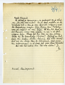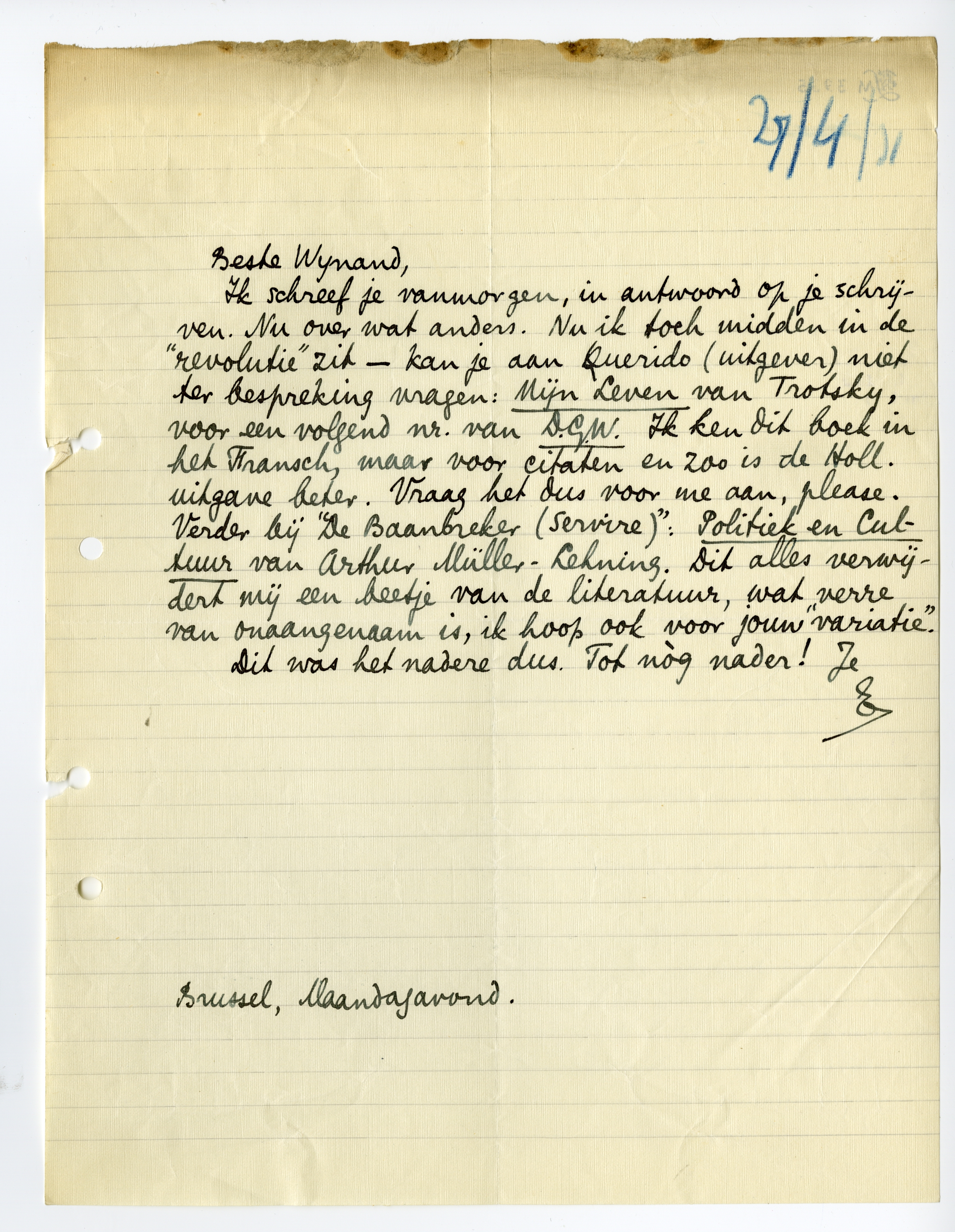 Ik schreef je vanmorgen, in antwoord op je schrijven. Nu over wat anders. Nu ik toch midden in de ‘revolutie’ zit - kan je aan Querido (uitgever) niet ter bespreking vragen: Mijn Leven van Trotsky, voor een volgend nr. van D.G.W.1749 Ik ken dit boek in het Fransch, maar voor citaten en zoo is de Holl. uitgave beter. Vraag het dus voor me aan, please. Verder bij ‘De Baanbreker (Servire)’: Politiek en Cultuur van Arthur Müller-Lehning. Dit alles verwijdert mij een beetje van de literatuur, wat verre van onaangenaam is, ik hoop ook voor jouw ‘variatie’.