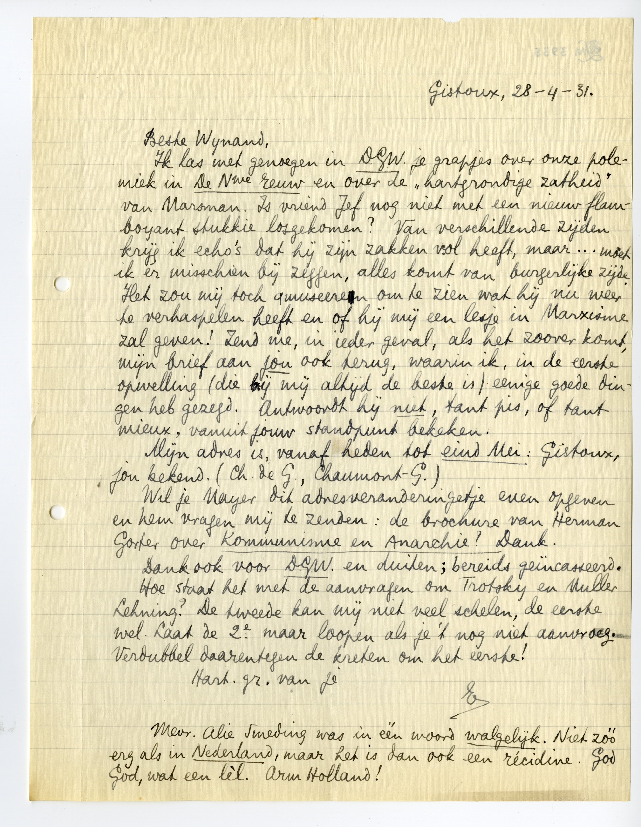 Wil je Mayer dit adresveranderingetje even opgeven en hem vragen mij te zenden: de brochure van Herman Gorter over Kommunisme en Anarchie? Dank.