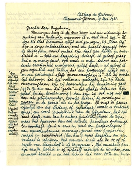 Ik liet u door Stols een pers-ex. sturen van Voor kleine Parochie; hij was ditmaal karig met zijn auteursexx. Heeft u het al? Las u reeds mijn anti-‘Gemeenschaps’-stukje? Ik verwacht van u een bespre-king, maar misschien doet u beter daarvoor even te wachten op het 2e deel,1773 dat eigenlijk geheel hierbij aansluit. Ik kreeg de drukproeven er reeds van, en Stols maakt er haast mee. Maar wilt u ieder deel apart behandelen, mij is dat natuurlijk wel zoo lief. Of neen, terwille van de gelijkenis van het portret, misschien toch weer niet... Trouwens, ù beslist!