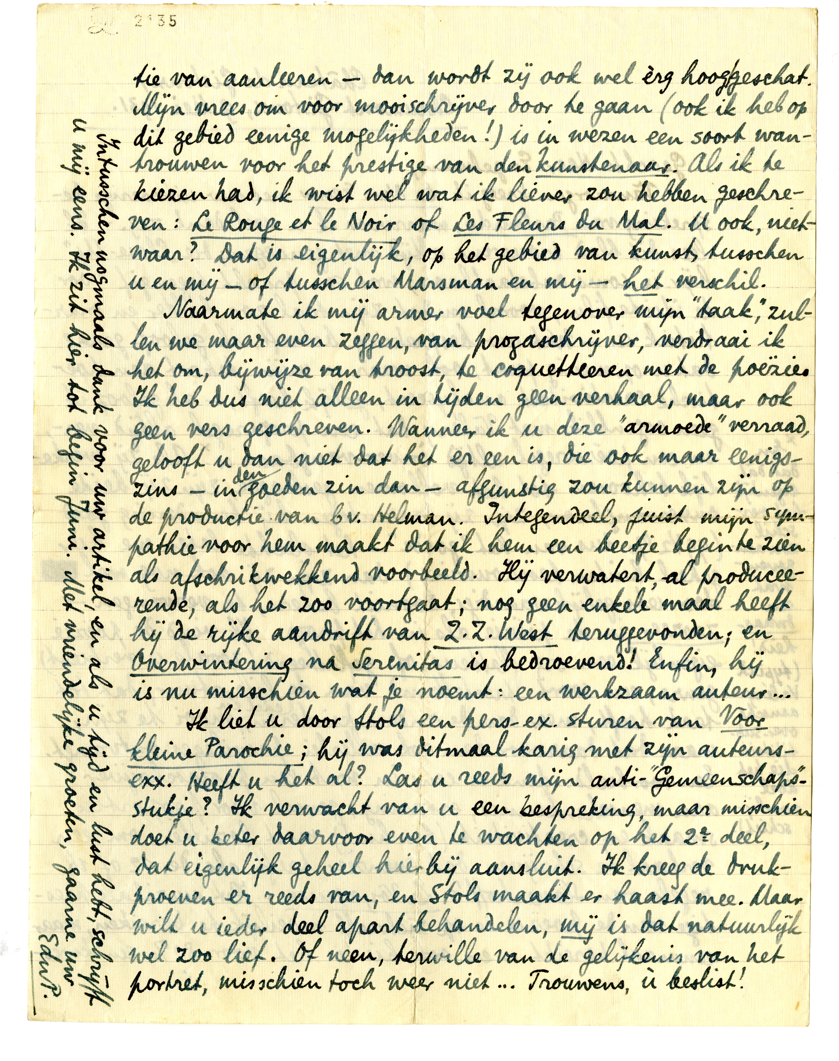Vanmorgen kreeg ik De Nwe Eeuw met uw uitvoerige bespreking van Parlando,1767 waarvoor ik u veel dank zeg. - Ik lees dit blad trouwens altijd met genoegen; die ‘Close-Up’1768 bijv. is soms onbetaalbaar; wat een pracht-tegengif voor de idiote film, vooral omdat zijn taal zoo helder en onartistiek is. - Wat uw bespreking betreft, ik geloof graag dat u op menig punt, ook waar u mijn tekort aan poëtische creativiteit analyseert, gelijk heeft, - al geloof ik geen oogenblik met Valéry dat een prozaregel altijd ver-, en een poëzieregel altijd ònver-vangbaar is.*1769 Als zij werkelijk behooren tot het volkomen geslaagde, zijn zij beide onvervangbaar; zijn zij daarentegen bij benadering goed (99½% dus van het ‘goede’ - het slechte laten we hier geheel buiten beschouwing) dan zijn zij ook nog wel door iets gelijkwaardigs, zooniet beters, te vervangen - zoozeer in de poëzie als in het proza. Ik vind de poëzie eigenlijk een erg flatteus, of geflatteerd (zooals u verkiest) genre, een soort troetelkind van de literatuur, dat tot taak heeft, meer dan de andere kinderen, edel en mooi te zijn, maar dat daarvoor dan ook allerlei privileges ontvangt. Een voorbeeld: denk u eens in wat een prozaschrijver aan menschenkennis, ervaring, gevoel voor proporties, smaak en creativiteit (hm hm!) moet bezitten om een verhaal te schrijven dat evenzeer treft als de 12 of 16 regels van Slauerhoff's La Voyageuse.1770 Het muzikale prestige van de poëzie is op zichzelf moeilijk te bereiken, maar eenmaal bereikt - en ook hier is het voor 80% een kwestie van aanleeren - dan wordt zij ook wel èrg hooggeschat. Mijn vrees om voor mooischrijver door te gaan1771 (ook ik heb op dit gebied eenige mogelijkheden!) is in wezen een soort wantrouwen voor het prestige van den kunstenaar. Als ik te kiezen had, ik wist wel wat ik liever zou hebben geschreven: Le Rouge et le Noir of Les Fleurs du Mal. U ook, nietwaar? Dat is eigenlijk, op het gebied van kunst, tusschen u en mij - of tusschen Marsman en mij - het verschil.