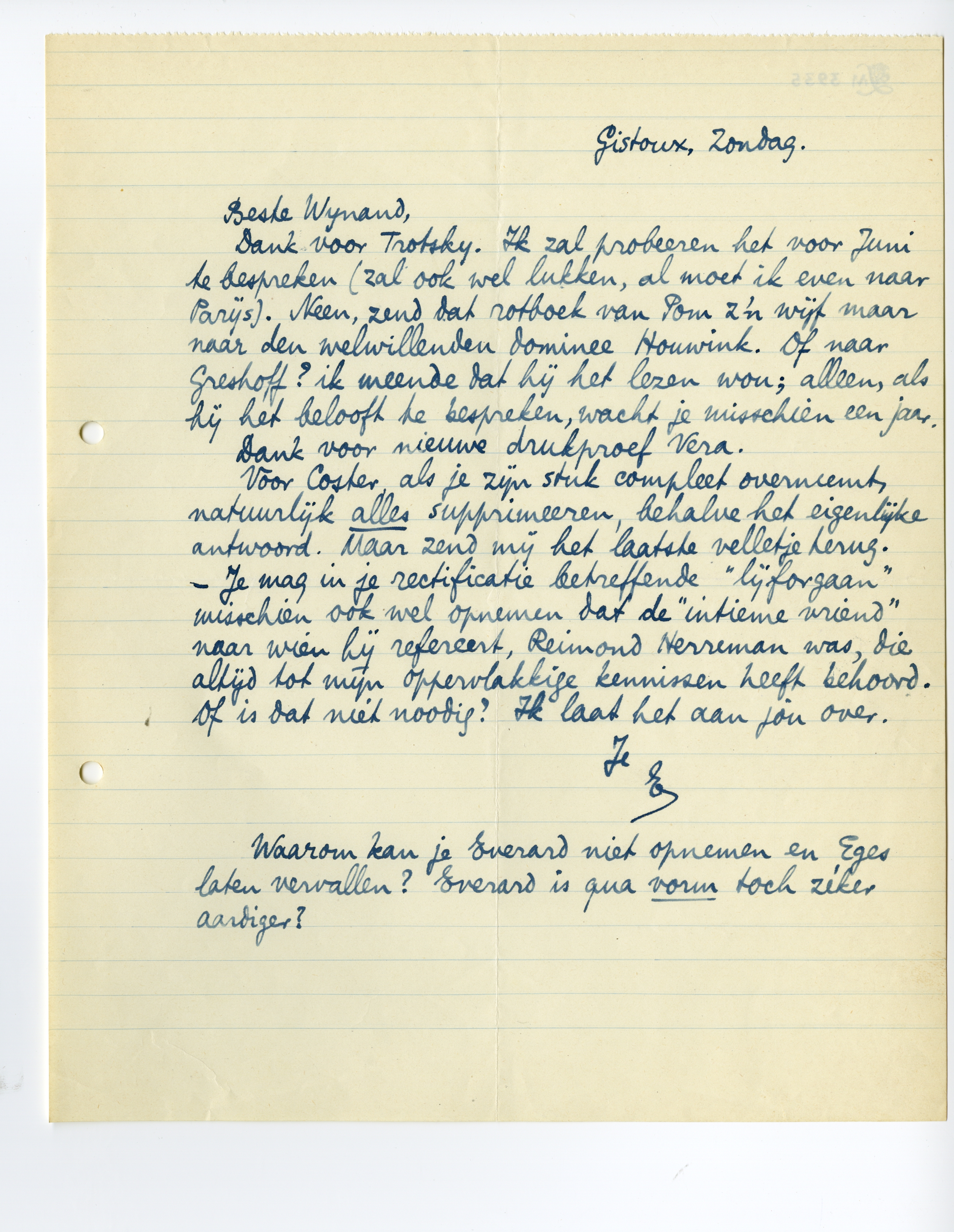 Voor Coster, als je zijn stuk compleet overneemt, natuurlijk alles supprimeeren, behalve het eigenlijke antwoord. Maar zend mij het laatste velletje terug. - Je mag in je rectificatie betreffende ‘lijforgaan’1804 misschien ook wel opnemen dat de ‘intieme vriend’ naar wien hij refereert, Reimond Herreman was, die altijd tot mijn oppervlakkige kennissen heeft behoord. Of is dat niet noodig? Ik laat het aan jou over.