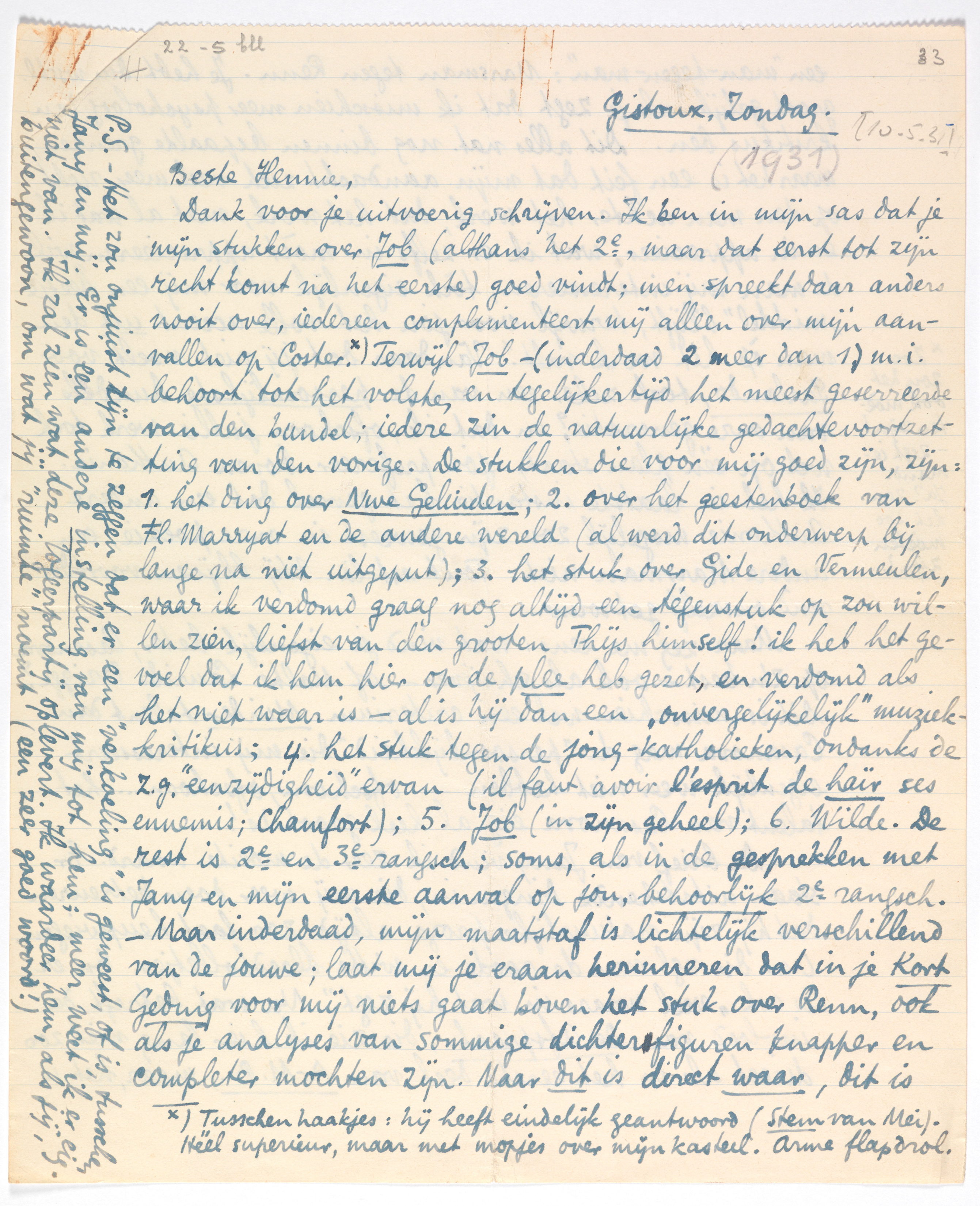 Dank voor je uitvoerig schrijven.1806 Ik ben in mijn sas dat je mijn stukken over Job (althans het 2e, maar dat eerst tot zijn recht komt na het eerste) goed vindt; men spreekt daar anders nooit over, iedereen complimenteert mij alleen over mijn aanvallen op Coster.* Terwijl Job - (inderdaad 2 meer dan 1) m.i. behoort tot het volste, en tegelijkertijd het meest geserreerde van den bundel; iedere zin de natuurlijke gedachtevoortzetting van den vorige. De stukken die voor mij goed zijn, zijn: 1. het ding over Nwe Geluiden; 2. over het geestenboek van Fl. Marryat en de andere wereld (al werd dit onderwerp bij lange na niet uitgeput); 3. het stuk over Gide en Vermeulen, waar ik verdomd graag nog altijd een tégenstuk op zou willen zien, liefst van den grooten Thijs himself! ik heb het gevoel dat ik hem hier op de plee heb gezet, en verdomd als het niet waar is - al is hij dan een ‘onvergelijkelijk’ muziekkritikus; 4. het stuk tegen de jong-katholieken, ondanks de z.g. ‘eenzijdigheid’ ervan (il faut avoir l'esprit de haïr ses ennemis1807; Chamfort); 5. Job (in zijn geheel); 6. Wilde. De rest is 2e en 3e rangsch; soms, als in de gesprekken met Jany en mijn eerste aanval op jou, behoorlijk 2e rangsch. - Maar inderdaad, mijn maatstaf is lichtelijk verschillend van de jouwe; laat mij je eraan herinneren dat in je Kort Geding voor mij niets gaat boven het stuk over Renn, ook als je analyses van sommige dichterfiguren knapper en completer mochten zijn. Maar dit is direct waar, dit is een ‘man-tegen-man’: Marsman tegen Renn. Je hebt dus wschl. groot gelijk als je zegt dat ik misschien meer psycholoog dan kritikus ben. Dit alles nat. nog binnen bepaalde grenzen, maar het is een feit dat mijn aandacht zich veel meer richt op den man achter het werk, dat het werk, met al wat ik er in apprecieer, wat ik er zelfs in moèt apprecieeren wil de man mij interesseeren, tòch eigenlijk voor mij een beetje ‘middel’ blijft, terwijl voor jou het volle accent uit den man òp het werk valt.* Vandaar dat jij niet voelt voor Parlando, toch zeker een van de persoonlijkste bundels van onze generatie? en dat ik, ofschoon jullie werk toch wel op één plan staat, jou prefereer boven Anthonie. Ik heb in laatste instantie het gevoel dat een andere Anthonie mogelijk zou zijn geweest in onze poëzie, een andere Marsman niet. Tout est là. Wij blijven voortdurend onszelf getrouw.