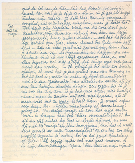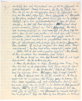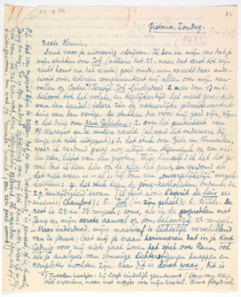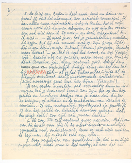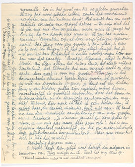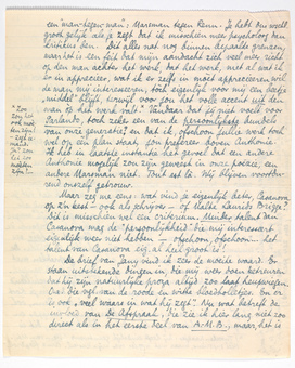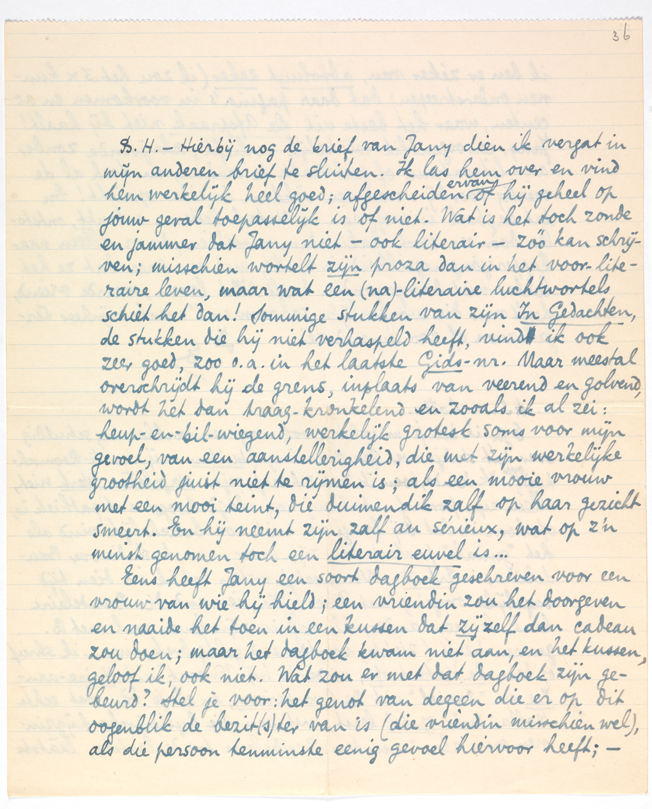 B.H. - Hierbij nog de brief van Jany dien ik vergat in mijn anderen brief te sluiten. Ik las hem over en vind hem werkelijk heel goed; afgescheiden ervan of hij geheel op jouw geval toepasselijk is of niet. Wat is het toch zonde en jammer dat Jany niet - ook literair - zóó kan schrijven; misschien wortelt zijn proza dan in het voor-literaire leven, maar wat een (na)-literaire luchtwortels schiet het dan! Sommige stukken van zijn In Gedachten, de stukken die hij niet verhaspeld heeft, vind ik ook zeer goed, zoo o.a. in het laatste Gids-nr.1815 Maar meestal overschrijdt hij de grens, inplaats van veerend en golvend, wordt het dan traag-kronkelend en zooals ik al zei: heup-enbil-wiegend, werkelijk grotesk soms voor mijn gevoel, van een aanstellerigheid, die met zijn werkelijke grootheidjuist niet te rijmen is; als een mooie vrouw met een mooi teint, die duimendik zalf op haar gezicht smeert. En hij neemt zijn zalf au sérieux, wat op z'n minst genomen toch een literair euvel is...