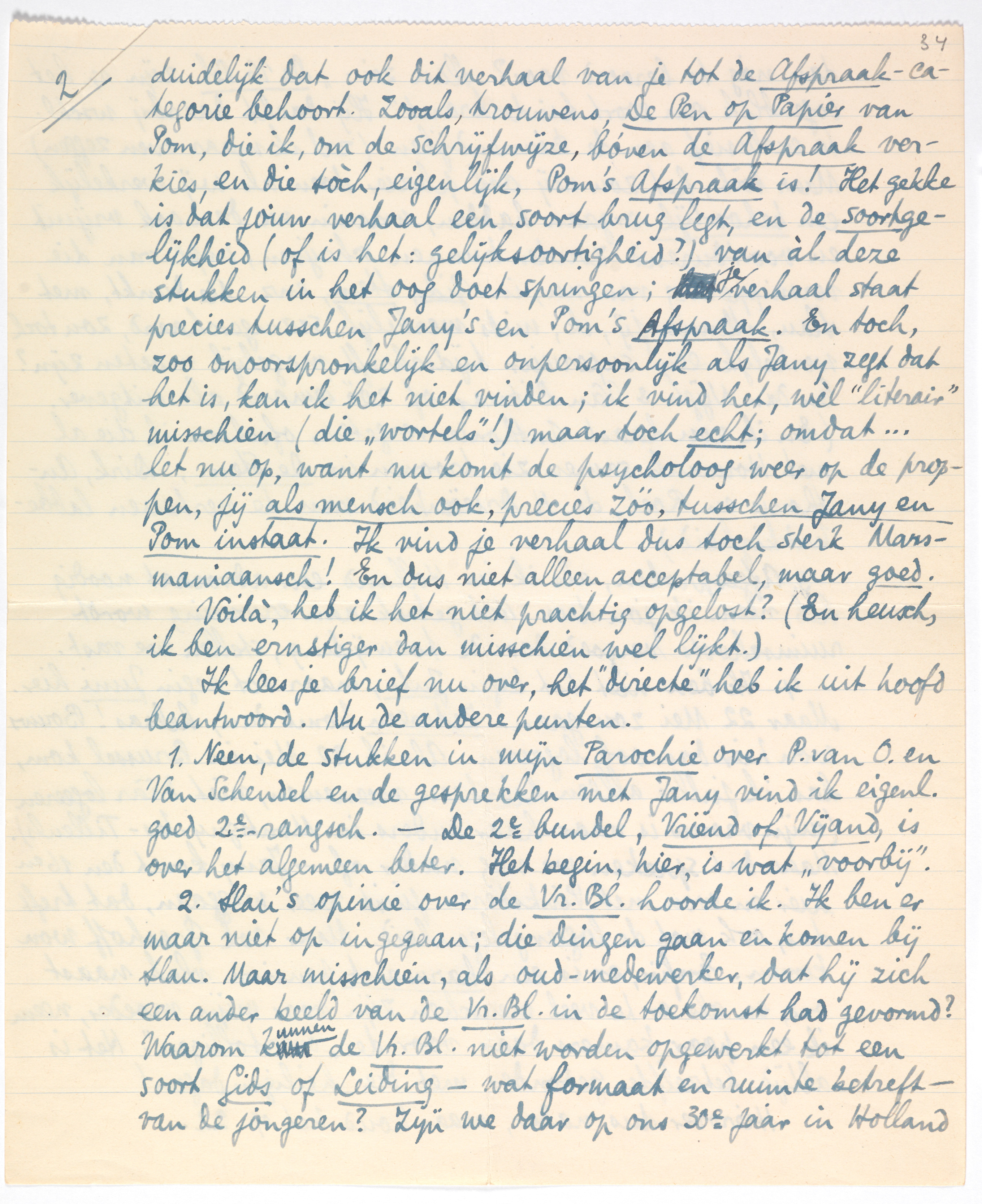 De brief van Jany1809 vind ik zeer de moeite waard. Er staan uitstekende dingen in, die mij weer doen betreuren dat hij zijn natuurlijke proza altijd zoo laat heupwiegen. O.a. die vgl. van de roode en witte bloedbolletjes. En er is ook ‘veel waars in wat hij zegt’. Nu wat betreft de invloed van De Afspraak, die zie ik hier lang niet zoo direct als in het eerste deel van A.-M.B., maar, het is duidelijk dat ook dit verhaal van je1810 tot de Afspraak-categorie behoort. Zooals, trouwens, De Pen op Papier van Pom, die ik, om de schrijfwijze, bóven de Afspraak verkies, en die tòch, eigenlijk, Pom's Afspraak is! Het gekke is dat jouw verhaal een soort brug legt, en de soortgelijkheid (of is het: gelijksoortigheid?) van àl deze stukken in het oog doet springen; je verhaal staat precies tusschen Jany's en Pom's Afspraak. En toch, zoo onoorspronkelijk en onpersoonlijk als Jany zegt dat het is, kan ik het niet vinden; ik vind het, wèl ‘literair’ misschien (die ‘wortels’!) maar toch echt; omdat... let nu op, want nu komt de psycholoog weer op de proppen, jij als mensch ook, precies zóó, tusschen Jany en Pom instaat. Ik vind je verhaal dus toch sterk Marsmaniaansch! En dus niet alleen acceptabel, maar goed.