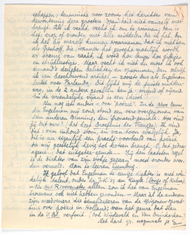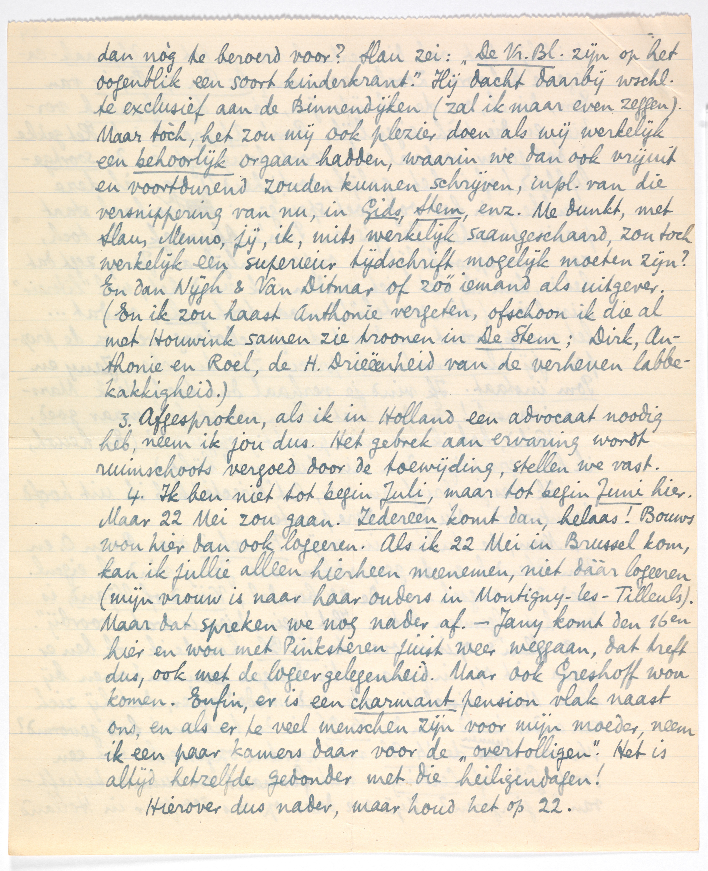 | 4. | Ik ben niet tot begin Juli, maar tot begin Juni hier. Maar 22 Mei zou gaan. Iedereen komt dan, helaas! Bouws wou hier dan ook logeeren. Als ik 22 Mei in Brussel kom, kan ik jullie alleen hierheen meenemen, niet dààr logeeren (mijn vrouw is naar haar ouders in Montigny-les-Tilleuls). Maar dat spreken we nog nader af. - Jany komt den 16en hier en wou met Pinksteren juist weer weggaan, dat treft dus, ook met de logeergelegenheid. Maar ook Greshoff wou komen. Enfin, er is een charmant pension vlak naast ons, en als er te veel menschen zijn voor mijn moeder, neem ik een paar kamers daar voor de ‘overtolligen’. Het is altijd hetzelfde gedonder met die heiligendagen!