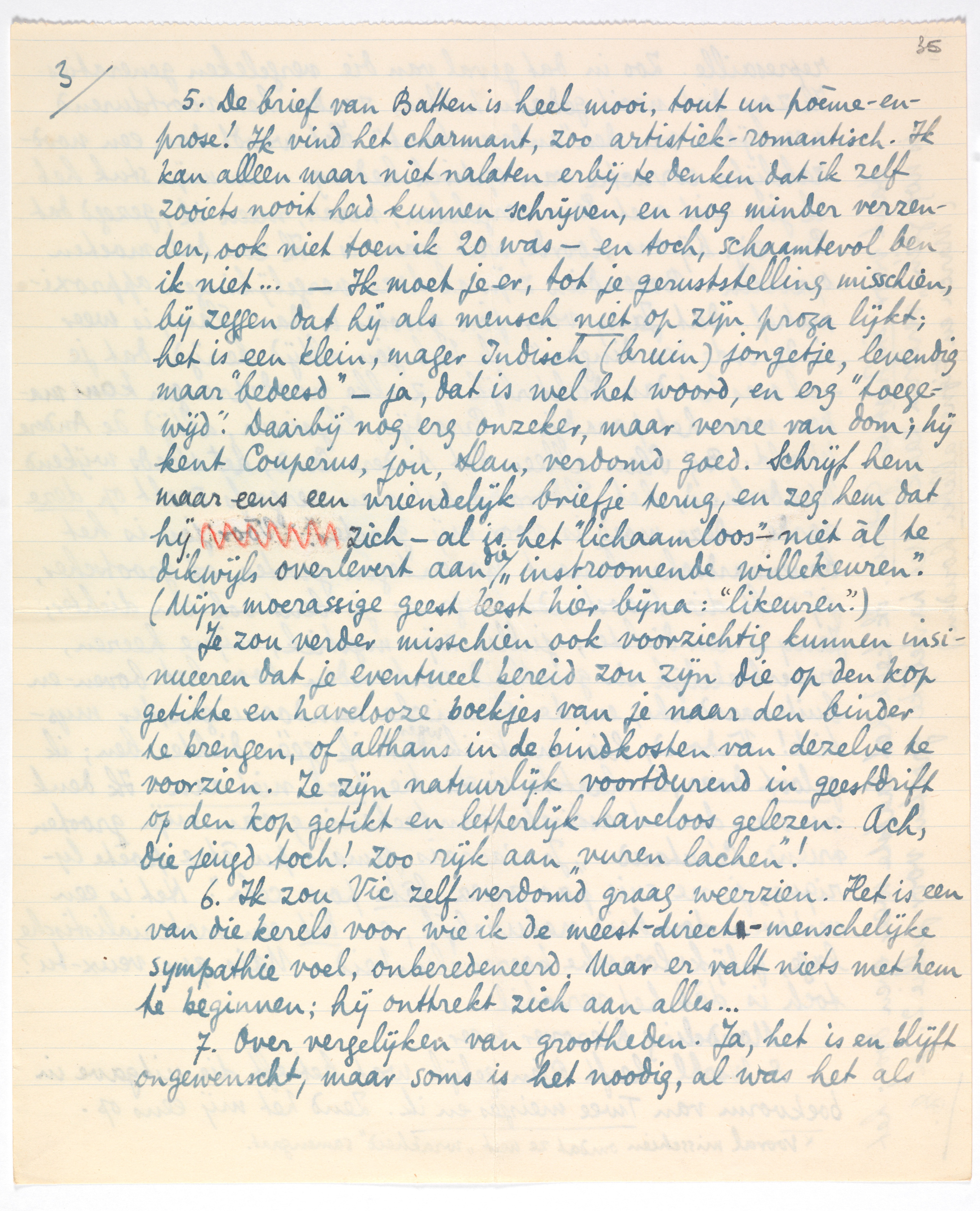 | 5. | De brief van Batten is heel mooi, tout un poème-en-prose! Ik vind het charmant, zoo artistiek-romantisch. Ik kan alleen maar niet nalaten erbij te denken dat ik zelf zooiets nooit had kunnen schrijven, en nog minder verzenden, ook niet toen ik 20 was - en toch, schaamtevol ben ik niet... - Ik moet je er, tot je geruststelling misschien, bij zeggen dat hij als mensch niet op zijn proza lijkt; het is een klein, mager Indisch (bruin) jongetje, levendig maar ‘bedeesd’ - ja, dat is wel het woord, en erg ‘toegewijd’. Daarbij nog erg onzeker, maar verre van dom; hij kent Couperus, jou, Slau, verdomd goed. Schrijf hem maar eens een vriendelijk briefje terug, en zeg hem dat hij zich - al is het ‘lichaamloos’ - niet àl te dikwijls overlevert aan die ‘instroomende willekeuren’. (Mijn moerassige geest leest hier bijna: ‘likeuren’.)