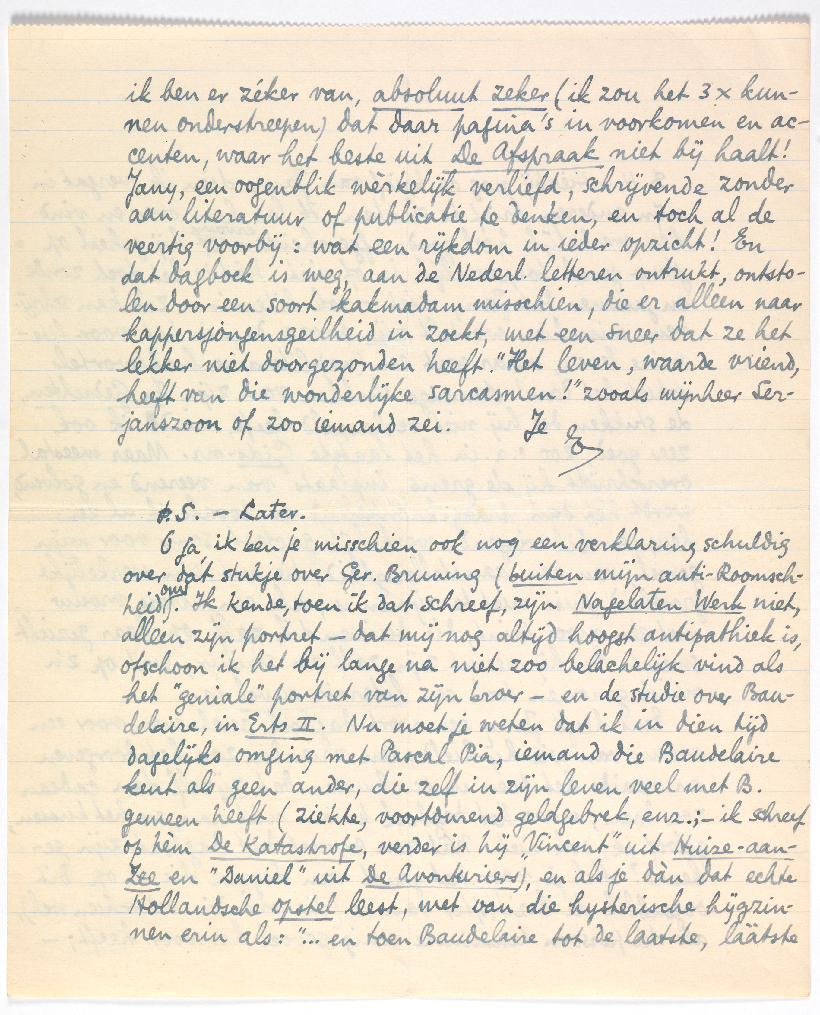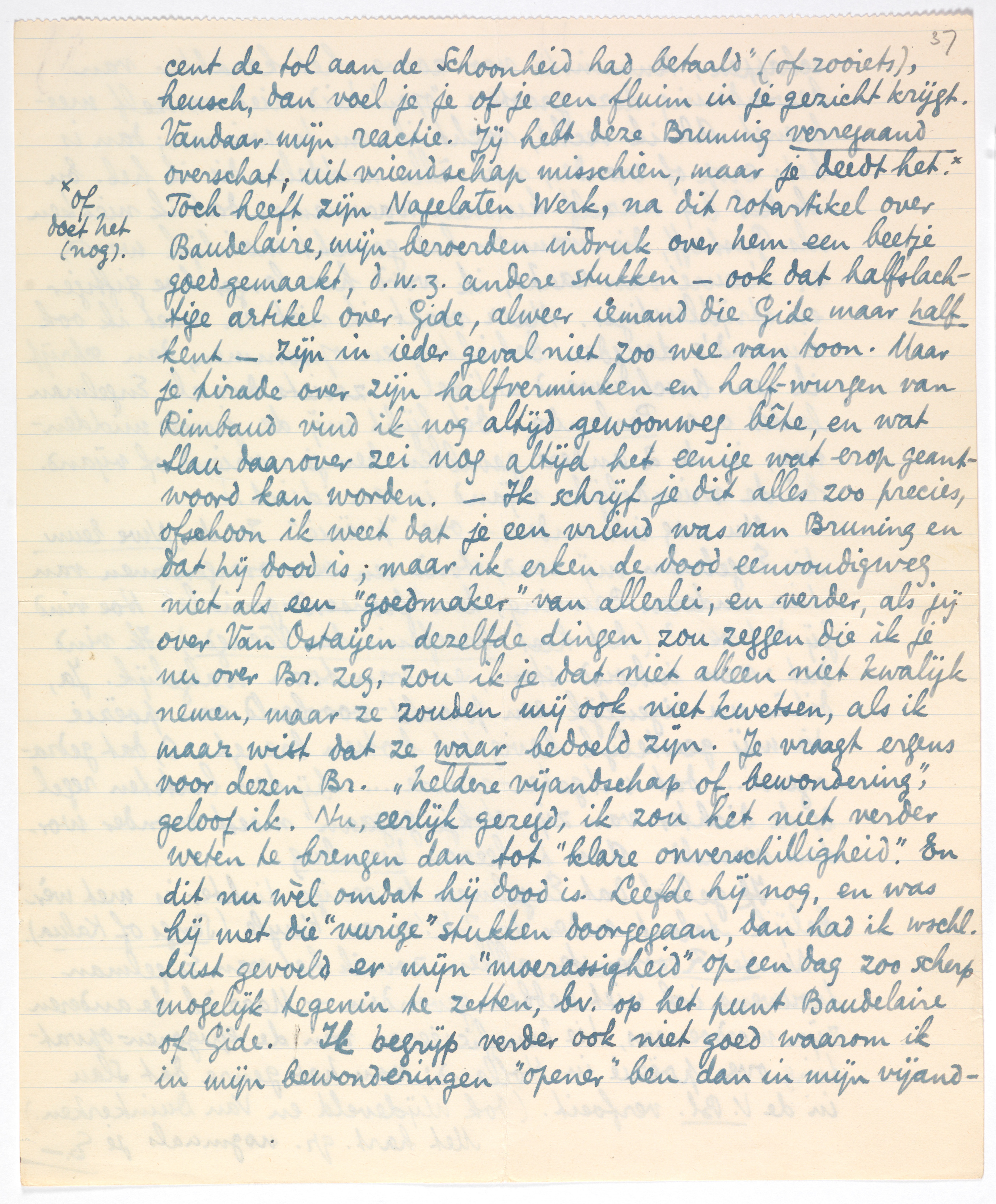 O ja, ik ben je misschien ook nog een verklaring schuldig over dat stukje over Ger. Bruning1817 (buiten mijn anti-Roomschheid om). Ik kende, toen ik dat schreef, zijn Nagelaten Werk niet, alleen zijn portret - dat mij nog altijd hoogst antipathiek is, ofschoon ik het bij lange na niet zoo belachelijk vind als het ‘geniale’ portret van zijn broer - en de studie over Baudelaire,1818 in Erts II. Nu moet je weten dat ik in dien tijd dagelijks omging met Pascal Pia, iemand die Baudelaire kent als geen ander, die zelf in zijn leven veel met B. gemeen heeft (ziekte, voortdurend geldgebrek, enz.; - ik schreef op hèm De Katastrofe, verder is hij ‘Vincent’ uit Huize-aan-Zee en ‘Daniel’ uit De Avonturiers), en als je dàn dat echte Hollandsche opstel leest, met van die hysterische hijgzinnen erin als: ‘...en toen Baudelaire tot de laatste, láátste cent de tol aan de Schoonheid had betaald’ (of zooiets), heusch, dan voel je je of je een fluim in je gezicht krijgt. Vandaar mijn reactie. Jij hebt deze Bruning verregaand overschat; uit vriendschap misschien, maar je deedt het.* Toch heeft zijn Nagelaten Werk, na dit rotartikel over Baudelaire, mijn beroerden indruk over hem een beetje goedgemaakt, d.w.z. andere stukken - ook dat halfslachtige artikel over Gide,1819 alweer iemand die Gide maar half kent - zijn in ieder geval niet zoo wee van toon. Maar je tirade over zijn halfverminken en half-wurgen van Rimbaud1820 vind ik nog altijd gewoonweg bête, en wat Slau daarover zei nog altijd het eenige wat erop geantwoord kan worden. - Ik schrijf je dit alles zo precies, ofschoon ik weet dat je een vriend was van Bruning en dat hij dood is; maar ik erken de dood eenvoudigweg niet als een ‘goedmaker’ van allerlei, en verder, als jij over Van Ostaijen dezelfde dingen zou zeggen die ik je nu over Br. zeg, zou ik je dat niet alleen niet kwalijk nemen, maar ze zouden mij ook niet kwetsen, als ik maar wist dat ze waar bedoeld zijn. Je vraagt ergens voor dezen Br. ‘heldere vijandschap of bewondering’, geloof ik. Nu, eerlijk gezegd, ik zou het niet verder weten te brengen dan tot ‘klare onverschilligheid’. En dit nu wèl omdat hij dood is. Leefde hij nog, en was hij met die ‘vurige’ stukken doorgegaan, dan had ik wschl. lust gevoeld er mijn ‘moerassigheid’ op een dag zoo scherp mogelijk tegenin te zetten, bv. op het punt Baudelaire of Gide. Ik begrijp verder ook niet goed waarom ik in mijn bewonderingen ‘opener’ ben dan in mijn vijandschappen; tenminste voor zoover het karakter van bewondering deze grootere ‘open’-heid niet vanzelf meebrengt. Als ik vecht, vecht ik om te winnen; dan is het; erop of eronder, met àlle middelen die ik heb. En ik heb bij mezelf kunnen waarnemen dat ik niet ben als Greshoff, die, wanneer het gevecht moeilijk wordt, er écoeuré van raakt, ik word hoe langer hoe giftiger en strijdlustiger. Maar vecht ik niet en moet ik ook iemand's deugden belichten en opsommen, dan schrijf ik een beschouwend artikel - zooiets dus als Engelman laatst over Parlando.1821 Dit lijkt mij de juiste middenweg, in de 2 andere gevallen ben je; vriend of vijand. En de vriendelijke vijand is een idioot.