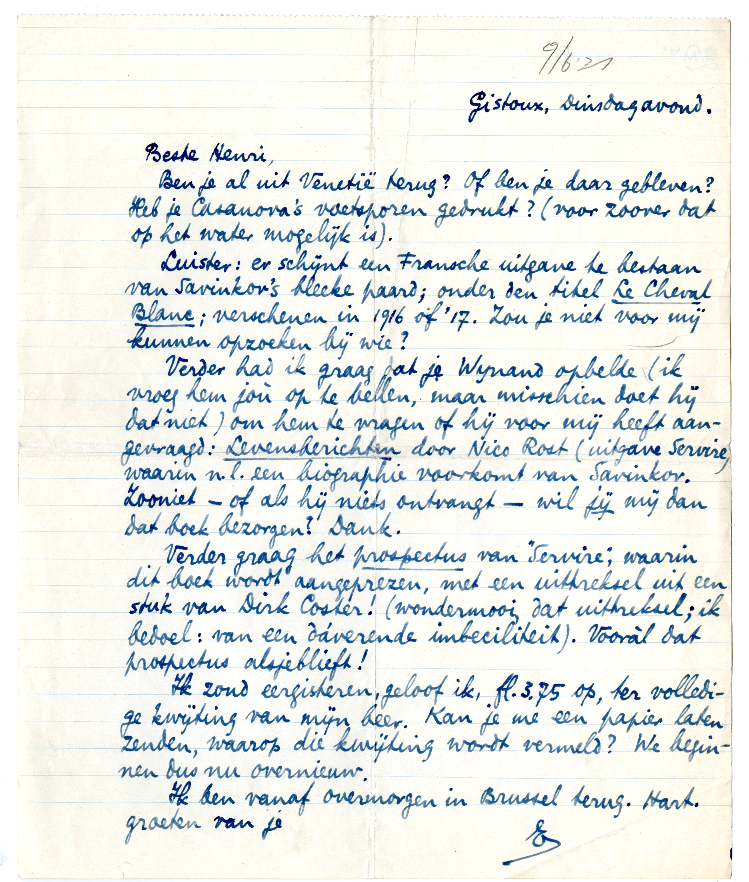 Luister: er schijnt een Fransche uitgave te bestaan van Savinkov's bleeke paard; onder den titel Le Cheval Blanc; verschenen in 1916 of '17. Zou je niet voor mij kunnen opzoeken bij wie?