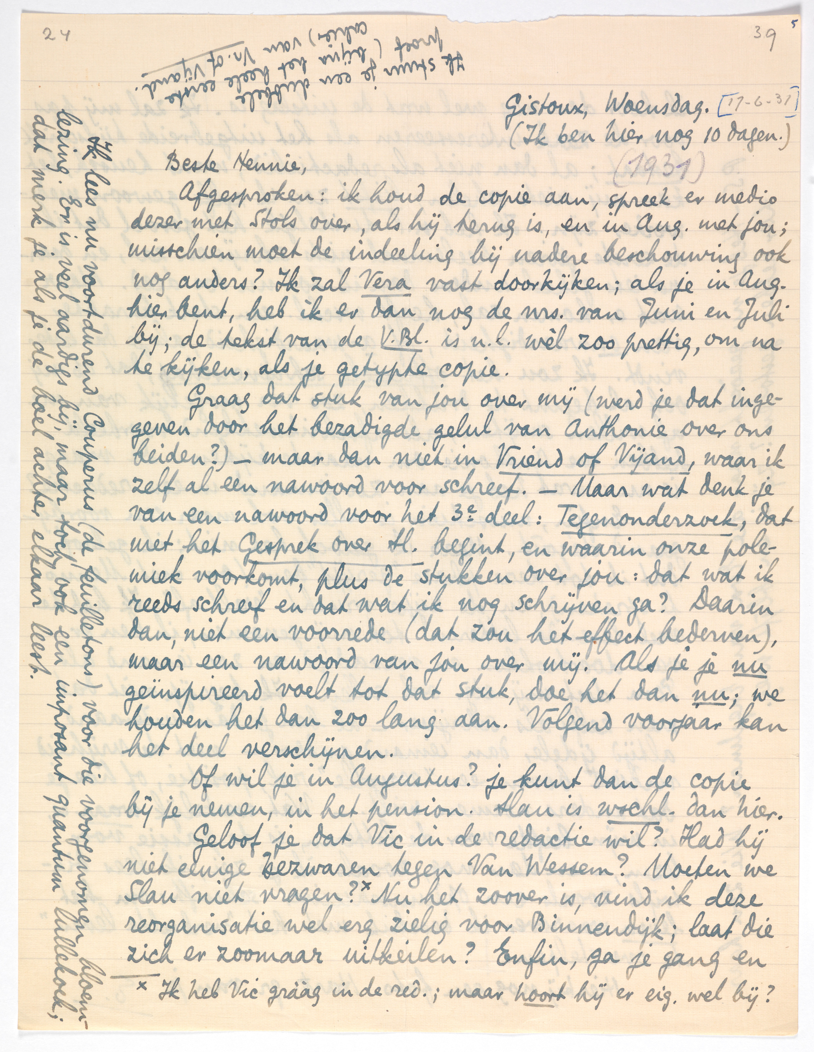 Geloof je dat Vic in de redactie wil?1849 Had hij niet eenige bezwaren tegen Van Wessem? Moeten we Slau niet vragen?* Nu het zoover is, vind ik deze reorganisatie wel erg zielig voor Binnendijk; laat die zich er zoomaar uitkeilen? Enfin, ga je gang en ik hoor dan nog wel wat de uitslag is. Ik zal mij pas voor de zaak interesseeren als het uitgebreide tijdschrift bestaat; al dan niet als redactielid, want heusch, het kan mij niets schelen; liefst zou ik zelfs gewoon medewerker zijn. Ik heb n.l. duidelijk het gevoel dat ik de eerste jaren heelemaal niets schrijven zal, en daarna iets geheel anders dan ik tot nu toe deed. Maar wat er komen zal, heeft wschl. een sterk karakter van onwaardigheid, of a-waardigheid, als je dat beter vindt. Ik zou het officieele schrijverschap, dat op mij ook al begint te drukken, zoo ver mogelijk van me af willen smijten; als afschrikwekkend voorbeeld hebben we Anthonie om naar te kijken. De vraag is nu: wat heb je aan zoo iemand in een redactie?