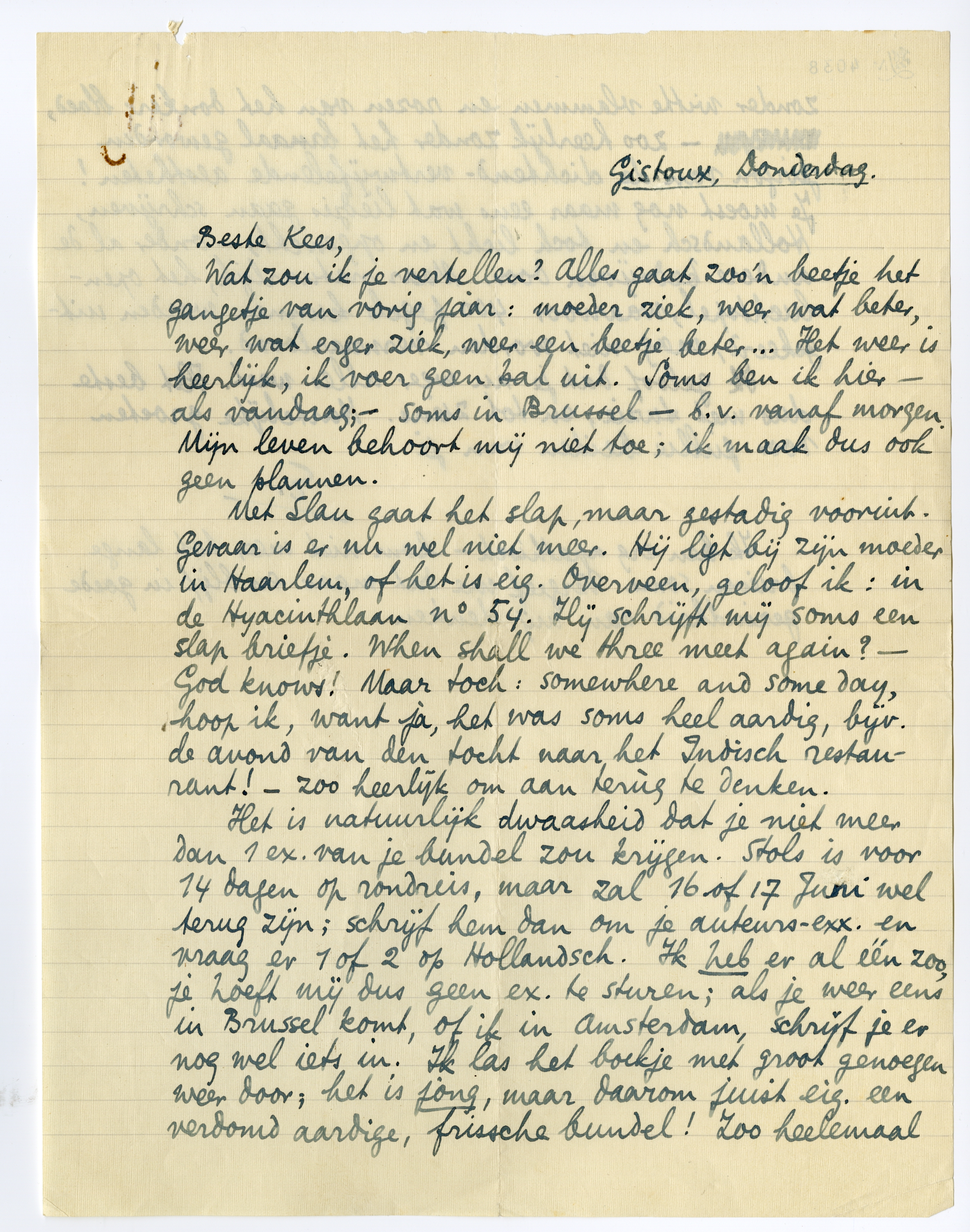 Met Slau gaat het slap, maar gestadig vooruit. Gevaar is er nu wel niet meer. Hij ligt bij zijn moeder in Haarlem, of het is eig. Overveen, geloof ik: in de Hyacinthlaan no 54. Hij schrijft mij soms een slap briefje. When shall we three meet again? - God knows! Maar toch: somewhere and someday, hoop ik, want ja, het was soms heel aardig, bijv. de avond van den tocht naar het Indisch restaurant! - zoo heerlijk om aan terùg te denken.