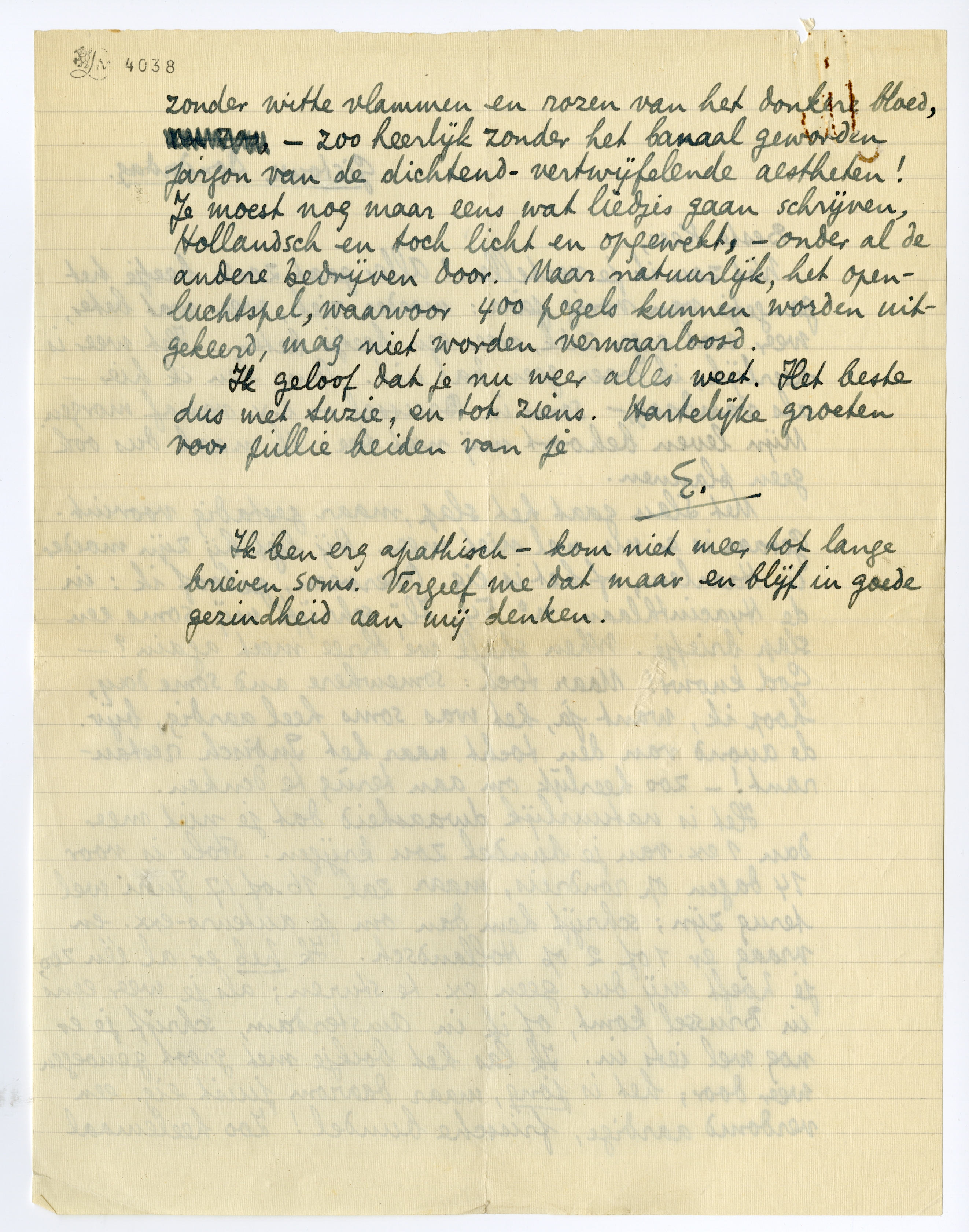 Ik ben erg apathisch - kom niet meer tot lange brieven soms. Vergeef me dat maar en blijf in goede gezindheid aan mij denken.