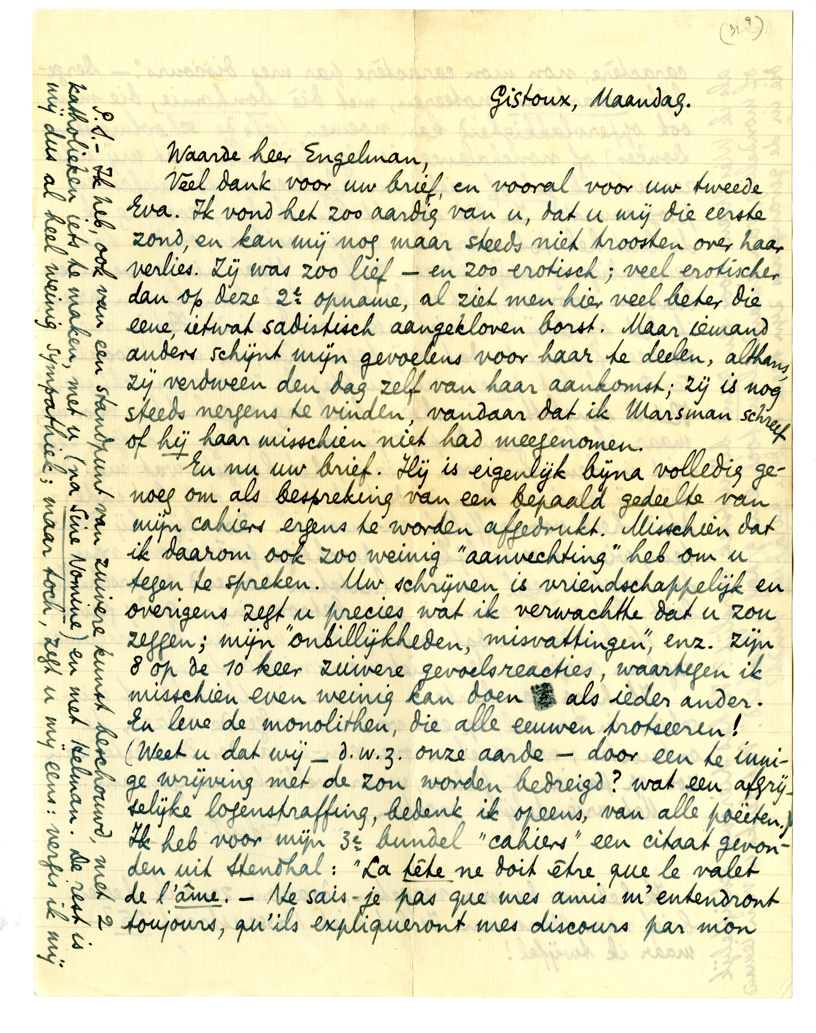 P.S. - Ik heb, ook van een standpunt van zuivere kunst beschouwd, met 2 katholieken iets te maken, met u (na Sine Nomine) en met Helman. De rest is mij dus al heel weinig sympathiek; maar toch, zegt u mij eens: vergis ik mij als ik Wies Moens voor een rund bij uitstek verslijt? Ik had hierover, schriftelijk of mondeling, van iemand als u toch eens graag ‘bescheid’. Wat denkt u van iemand die in de gevangenis ijn heele verdere karakter vindt?
