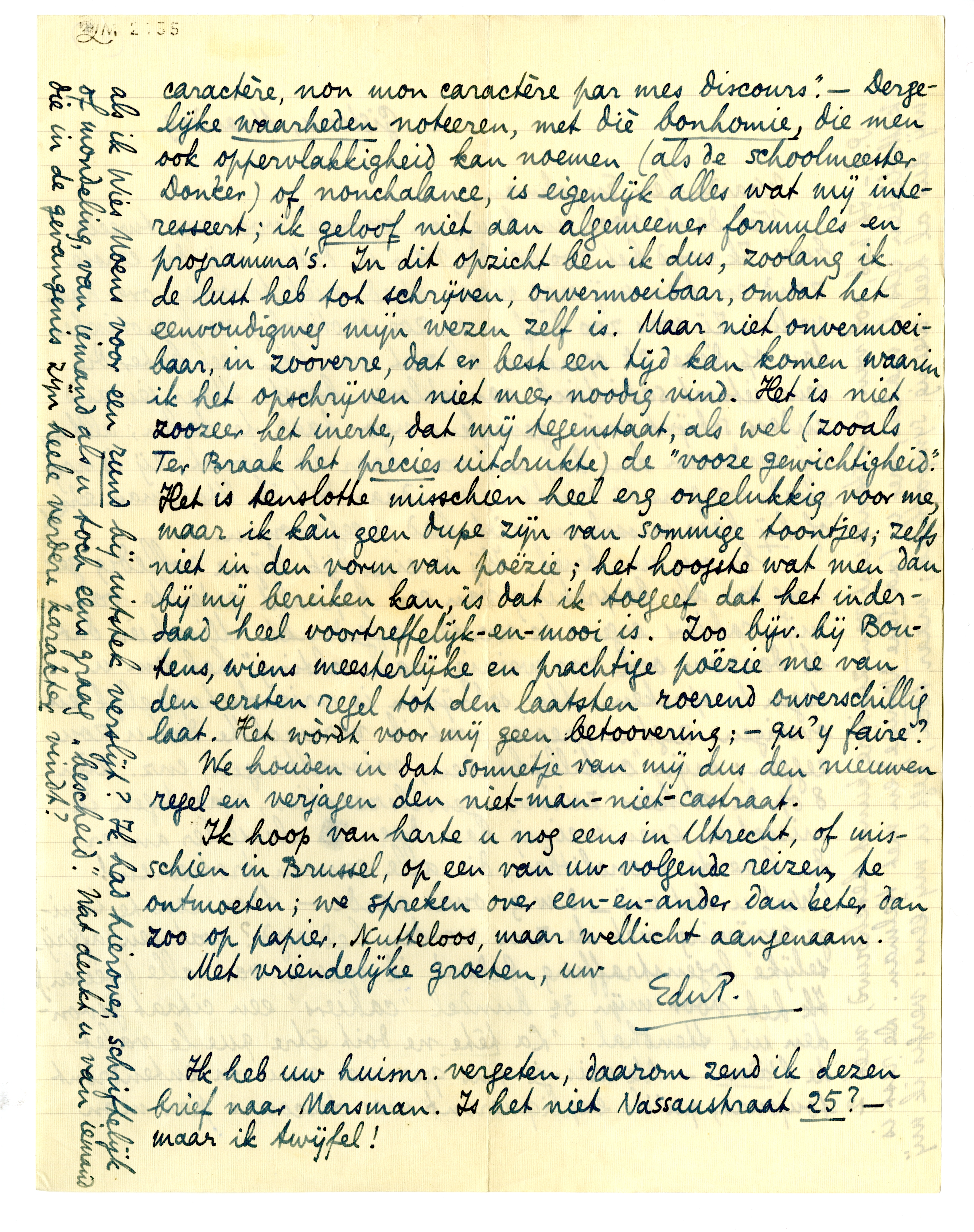 Ik heb uw huisnr. vergeten, daarom zend ik dezen brief naar Marsman. Is het niet Nassaustraat 25? - maar ik twijfel!