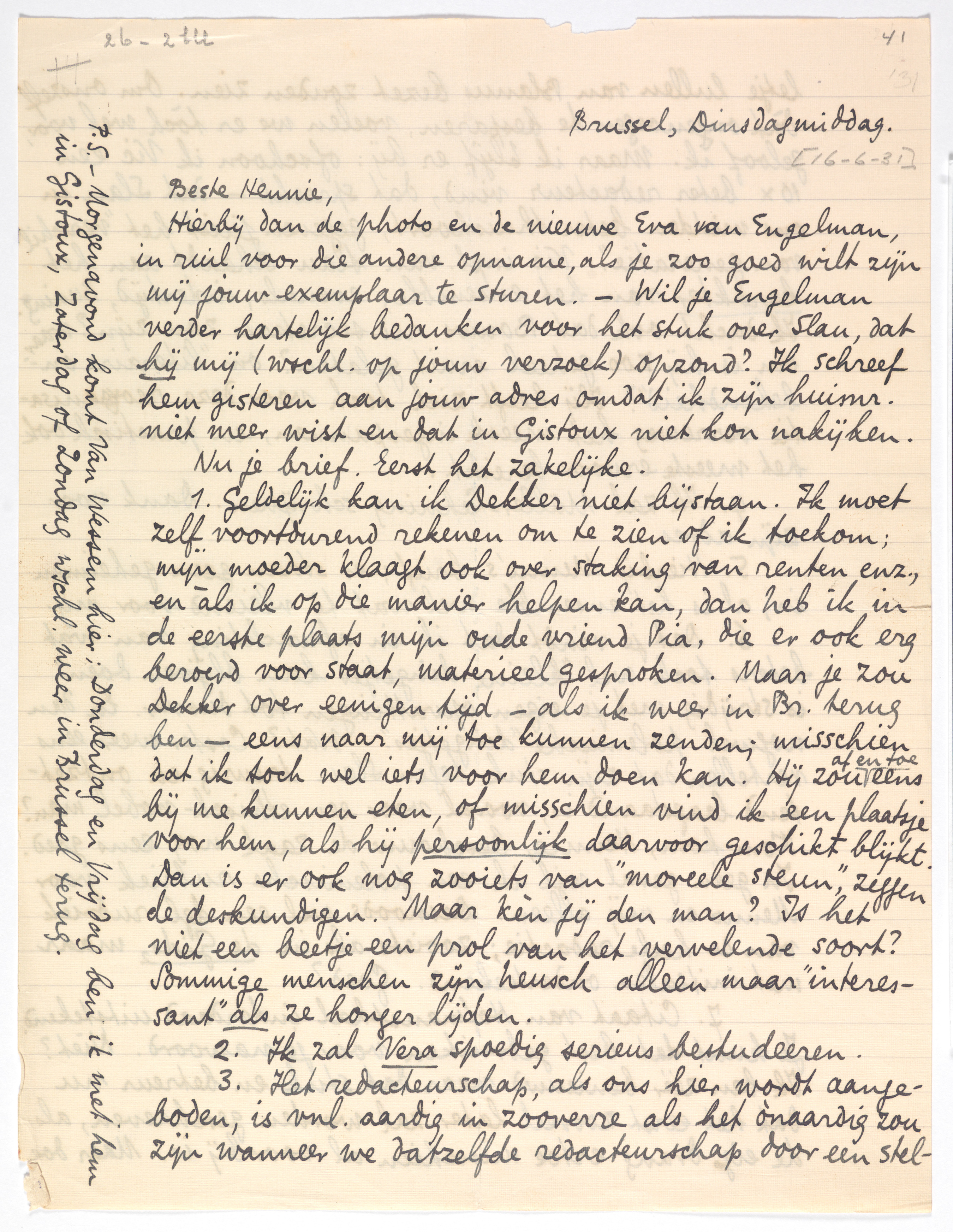 | 1. | Geldelijk kan ik Dekker1866 niet bijstaan. Ik moet zelf voortdurend rekenen om te zien of ik toekom; mijn moeder klaagt ook over staking van renten enz., en àls ik op die manier helpen kan, dan heb ik in de eerste plaats mijn oude vriend Pia, die er ook erg beroerd voor staat, materieel gesproken. Maar je zou Dekker over eenigen tijd - als ik weer in Br. terug ben - eens naar mij toe kunnen zenden; misschien dat ik toch wel iets voor hem doen kan. Hij zou af en toe eens bij me kunnen eten, of misschien vind ik een plaatsje voor hem, als hij persoonlijk daarvoor geschikt blijkt. Dan is er ook nog zooiets van ‘moreele steun’, zeggen de deskundigen. Maar kèn jij den man? Is het niet een beetje een prol van het vervelende soort? Sommige menschen zijn heusch alleen maar ‘interessant’ als ze honger lijden. |