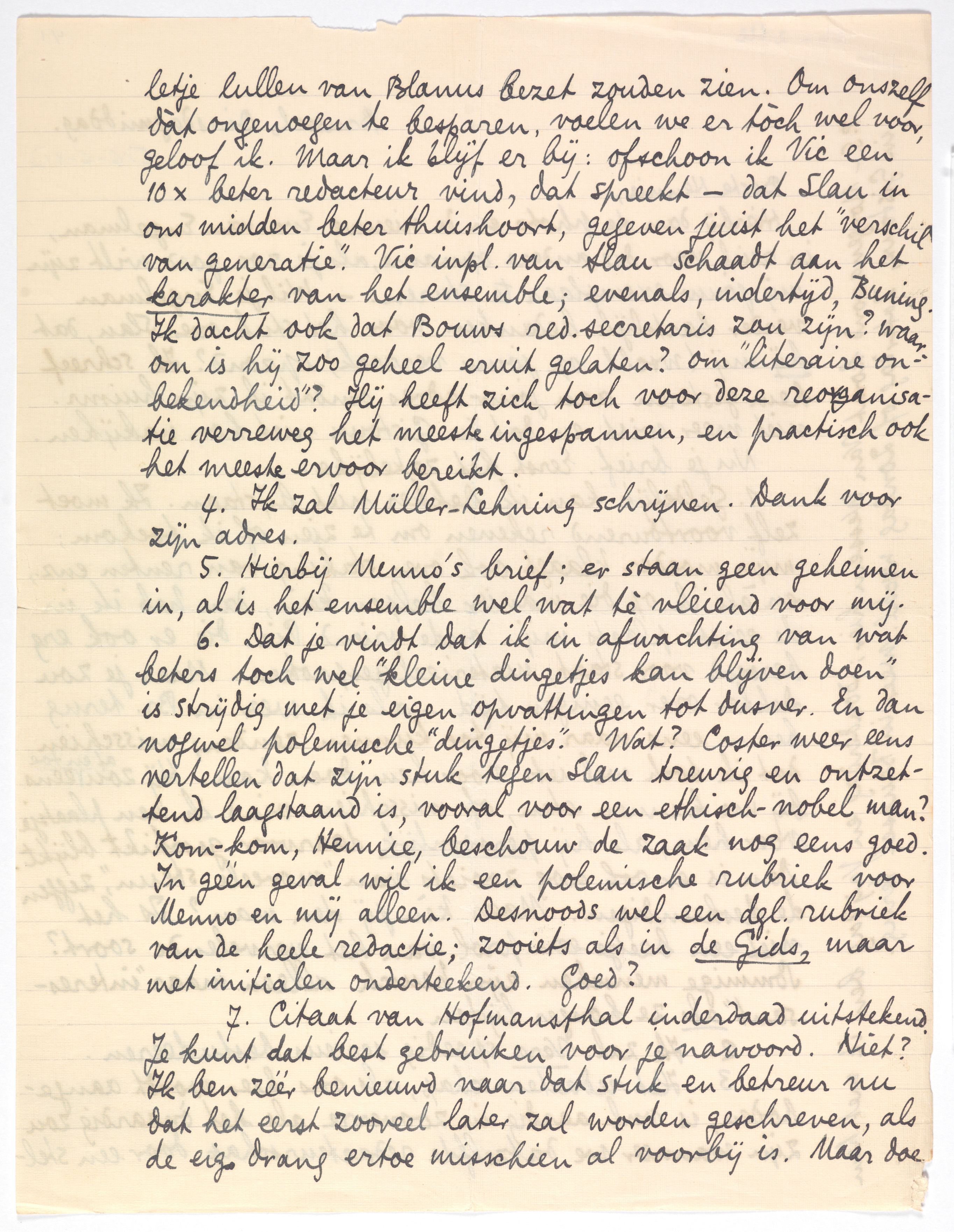 | 3. | Het redacteurschap, als ons hier wordt aangeboden,1867 is vnl. aardig in zooverre als het ònaardig zou zijn wanneer we datzelfde redacteurschap door een stelletje lullen van Blanus bezet zouden zien. Om onszelf dàt ongenoegen te besparen, voelen we er tòch wel voor, geloof ik. Maar ik blijf erbij: ofschoon ik Vic een 10× beter redacteur vind, dat spreekt - dat Slau in ons midden beter thuishoort, gegeven juist het ‘verschil van generatie’. Vic inpl. van Slau schaadt aan het karakter van het ensemble; evenals, indertijd, Buning.1868 Ik dacht ook dat Bouws red.secretaris zou zijn?1869 waarom is hij zoo geheel eruit gelaten? om ‘literaire onbekendheid’? Hij heeft zich toch voor deze reorganisatie verreweg het meeste ingespannen, en practisch ook het meeste ervoor bereikt. |