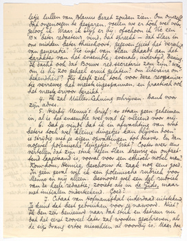 | 6. | Dat je vindt dat ik in afwachting van wat beters toch wel ‘kleine dingetjes kan blijven doen’ is strijdig met je eigen opvattingen tot dusver. En dan nogwel polemische ‘dingetjes’. Wat? Coster weer eens vertellen dat zijn stuk tegen Slau1871 treurig en ontzettend laagstaand is, vooral voor een ethisch-nobel man? Kom-kom, Hennie, beschouw de zaak nog eens goed. In géén geval wil ik een polemische rubriek voor Menno en mij alleen. Desnoods wel een dgl. rubriek van de heele redactie; zooiets als in de Gids, maar met initialen onderteekend. Goed? |