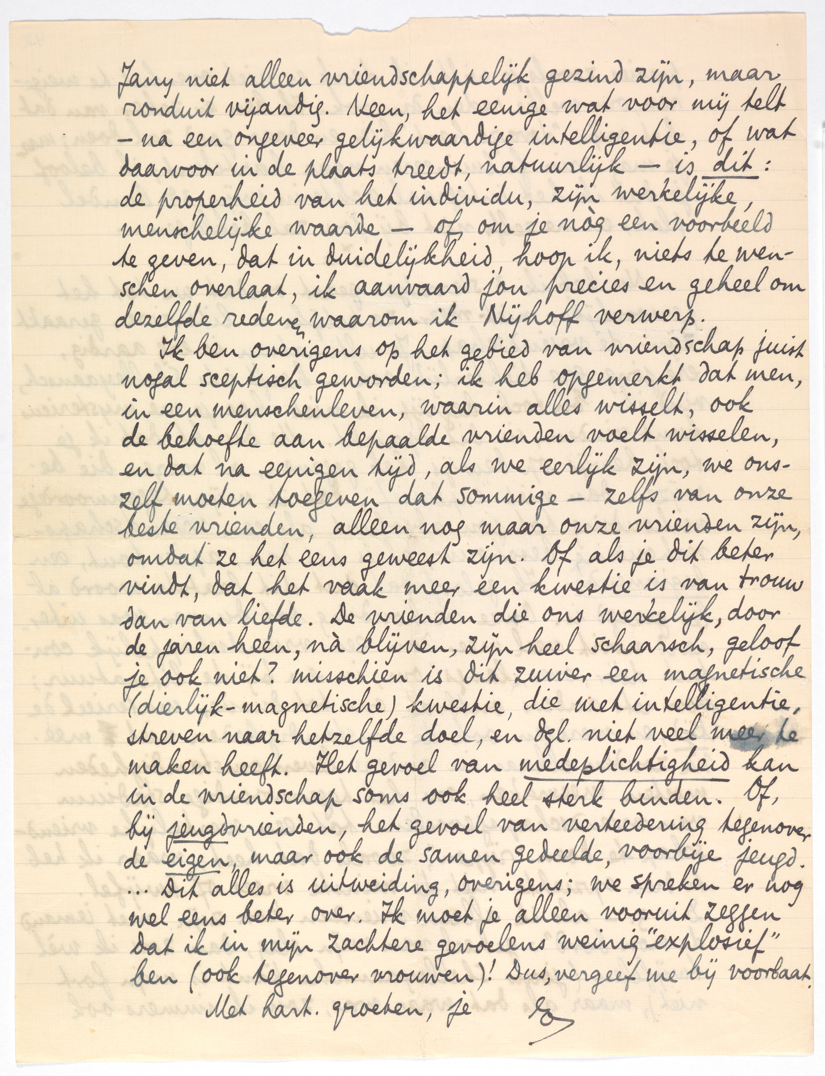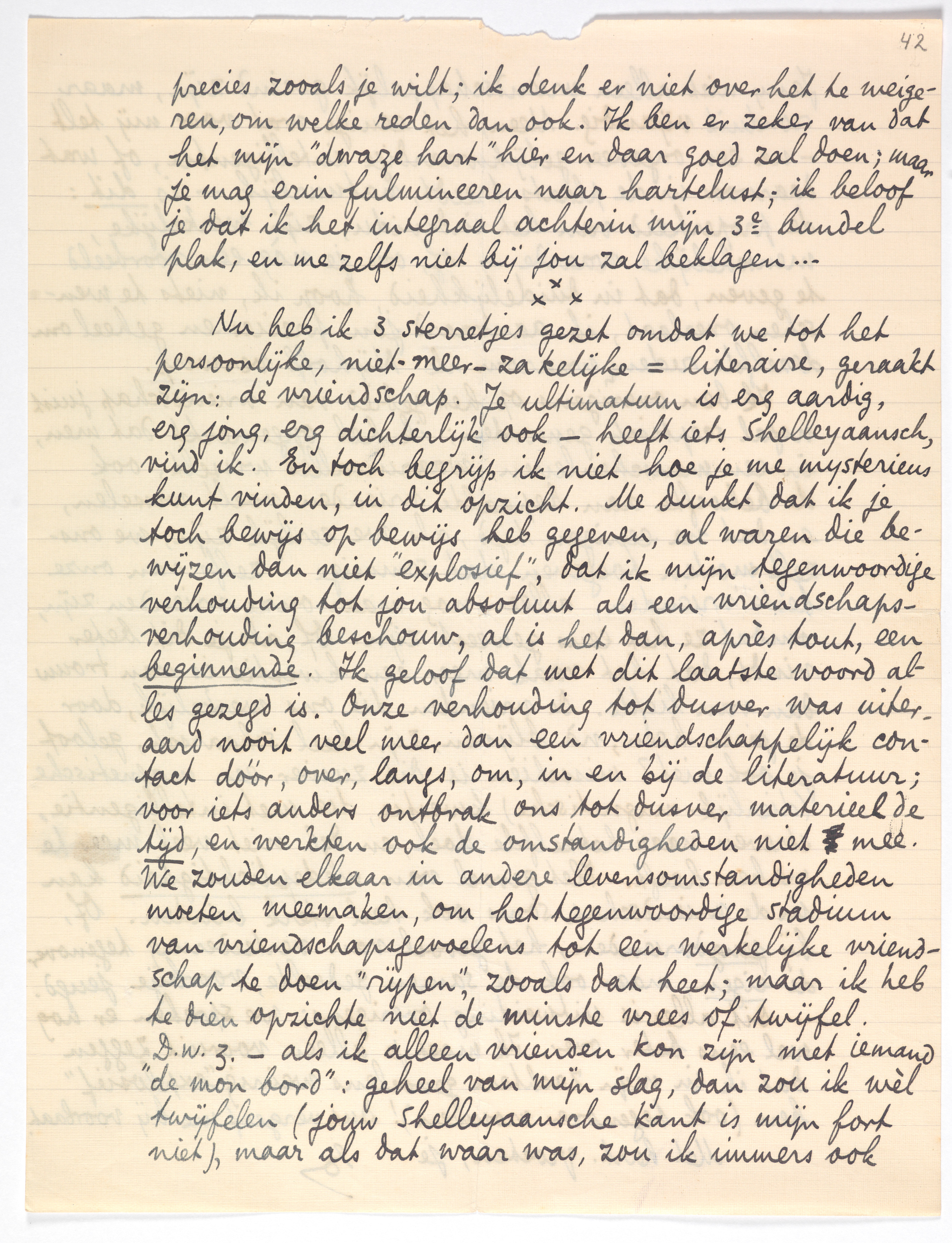 Nu heb ik 3 sterretjes gezet omdat we tot het persoonlijke, niet-meer-zakelijke=literaire, geraakt zijn: de vriendschap. Je ultimatum is erg aardig, erg jong, erg dichterlijk ook - heeft iets Shelleyaansch, vind ik. En toch begrijp ik niet hoe je me mysterieus kunt vinden, in dit opzicht. Me dunkt dat ik je toch bewijs op bewijs heb gegeven, al waren die bewijzen dan niet ‘explosief’, dat ik mijn tegenwoordige verhouding tot jou absoluut als een vriendschapsverhouding beschouw, al is het dan, après tout, een beginnende. Ik geloof dat met dit laatste woord alles gezegd is. Onze verhouding tot dusver was uiteraard nooit veel meer dan een vriendschappelijk contact dóór, over, langs, om, in en bij de literatuur; voor iets anders ontbrak ons tot dusver materieel de tijd, en werkten ook de omstandigheden niet mee. We zouden elkaar in andere levensomstandigheden moeten meemaken, om het tegenwoordige stadium van vriendschapsgevoelens tot een werkelijke vriendschap te doen ‘rijpen’, zooals dat heet; maar ik heb te dien opzichte niet de minste vrees of twijfel. D.w.z. - als ik alleen vrienden kon zijn met iemand ‘de mon bord’: geheel van mijn slag, dan zou ik wèl twijfelen (jouw Shelleyaansche kant is mijn fort niet), maar als dat waar was, zou ik immers ook Jany niet alleen vriendschappelijk gezind zijn, maar ronduit vijandig. Neen, het eenige wat voor mij telt - na een ongeveer gelijkwaardige intelligentie, of wat daarvoor in de plaats treedt, natuurlijk - is dit: de properheid van het individu, zijn werkelijke, menschelijke waarde - of, om je nòg een voorbeeld te geven, dat in duidelijkheid, hoop ik, niets te wenschen overlaat, ik aanvaard jou precies en geheel om dezelfde redenen waarom ik Nijhoff verwerp.