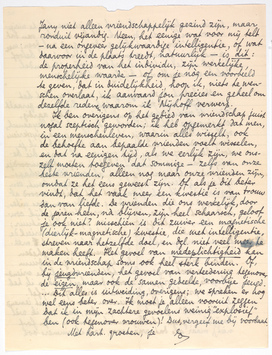 Ik ben overigens op het gebied van vriendschap juist nogal sceptisch geworden; ik heb opgemerkt dat men, in een menschenleven, waarin alles wisselt, ook de behoefte aan bepaalde vrienden voelt wisselen, en dat na eenigen tijd, als we eerlijk zijn, we onszelf moeten toegeven dat sommige - zelfs van onze beste vrienden, alleen nog maar onze vrienden zijn, omdat ze het eens geweest zijn. Of als je dit beter vindt, dat het vaak meer een kwestie is van trouw dan van liefde. De vrienden die ons werkelijk, door de jaren heen, nà blijven, zijn heel schaarsch, geloof je ook niet? misschien is dit zuiver een magnetische (dierlijk-magnetische) kwestie, die met intelligentie, streven naar hetzelfde doel, en dgl. niet veel meer te maken heeft. Het gevoel van medeplichtigheid kan in de vriendschap soms ook heel sterk binden. Of, bij jeugdvrienden, het gevoel van verteedering tegenover de eigen, maar ook de samen gedeelde, voorbije jeugd. ...Dit alles is uitweiding, overigens; we spreken er nog wel eens beter over. Ik moet je alleen vooruit zeggen dat ik in mijn zachtere gevoelens weinig ‘explosief’ ben (ook tegenover vrouwen)! Dus, vergeef me bij voorbaat.