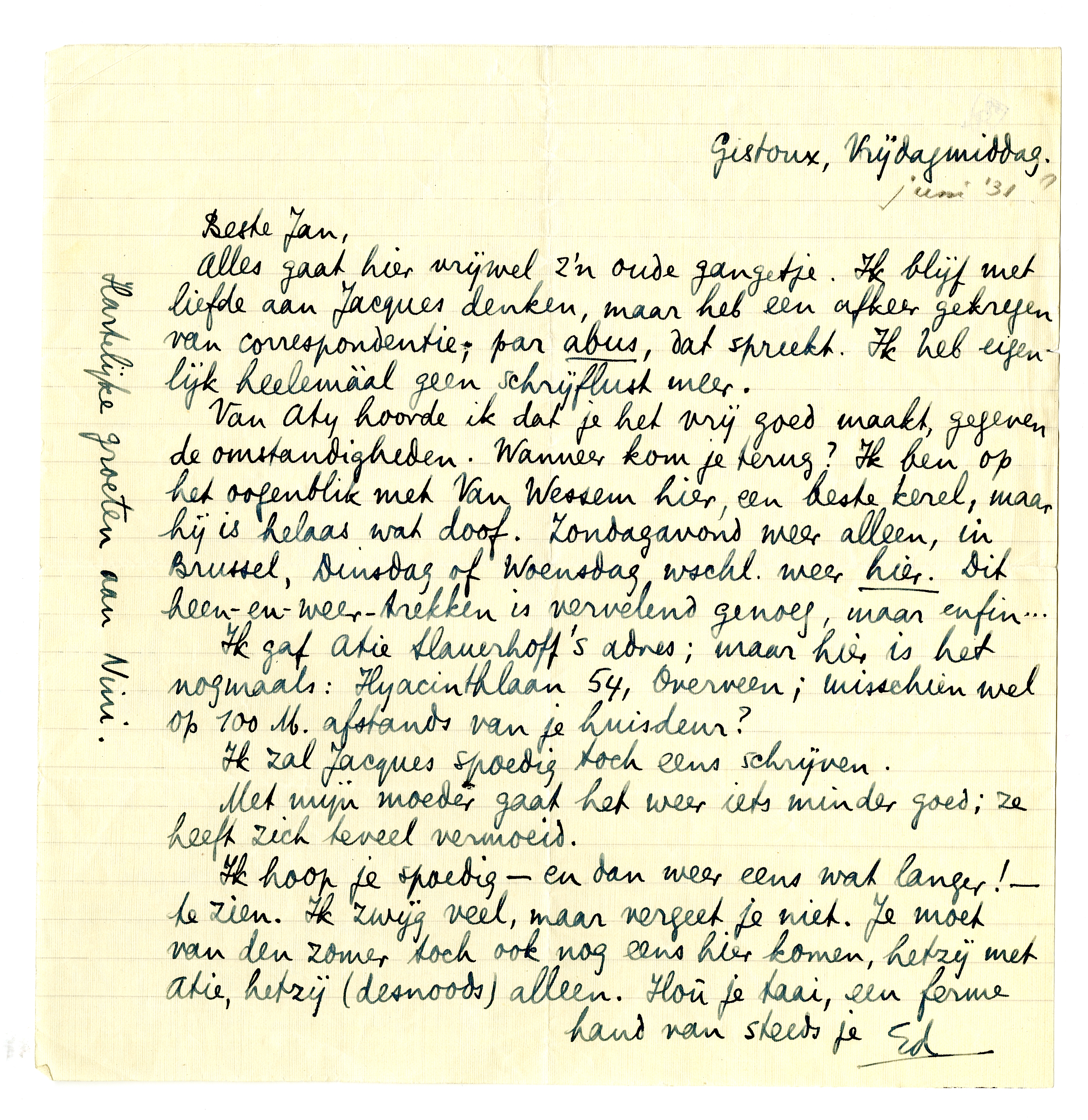 Van Aty hoorde ik dat je het vrij goed maakt, gegeven de omstandigheden. Wanneer kom je terug? Ik ben op het oogenblik met Van Wessem hier, een beste kerel, maar hij is helaas wat doof. Zondagavond weer alleen, in Brussel, Dinsdag of Woensdag wschl. weer hier. Dit heen-en-weer-trekken is vervelend genoeg, maar enfin...