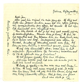Ik hoop je spoedig - en dan weer eens wat langer! - te zien. Ik zwijg veel, maar vergeet je niet. Je moet van den zomer toch ook nog eens hier komen, hetzij met Atie, hetzij (desnoods) alleen. Hoû je taai, een ferme hand van steeds je