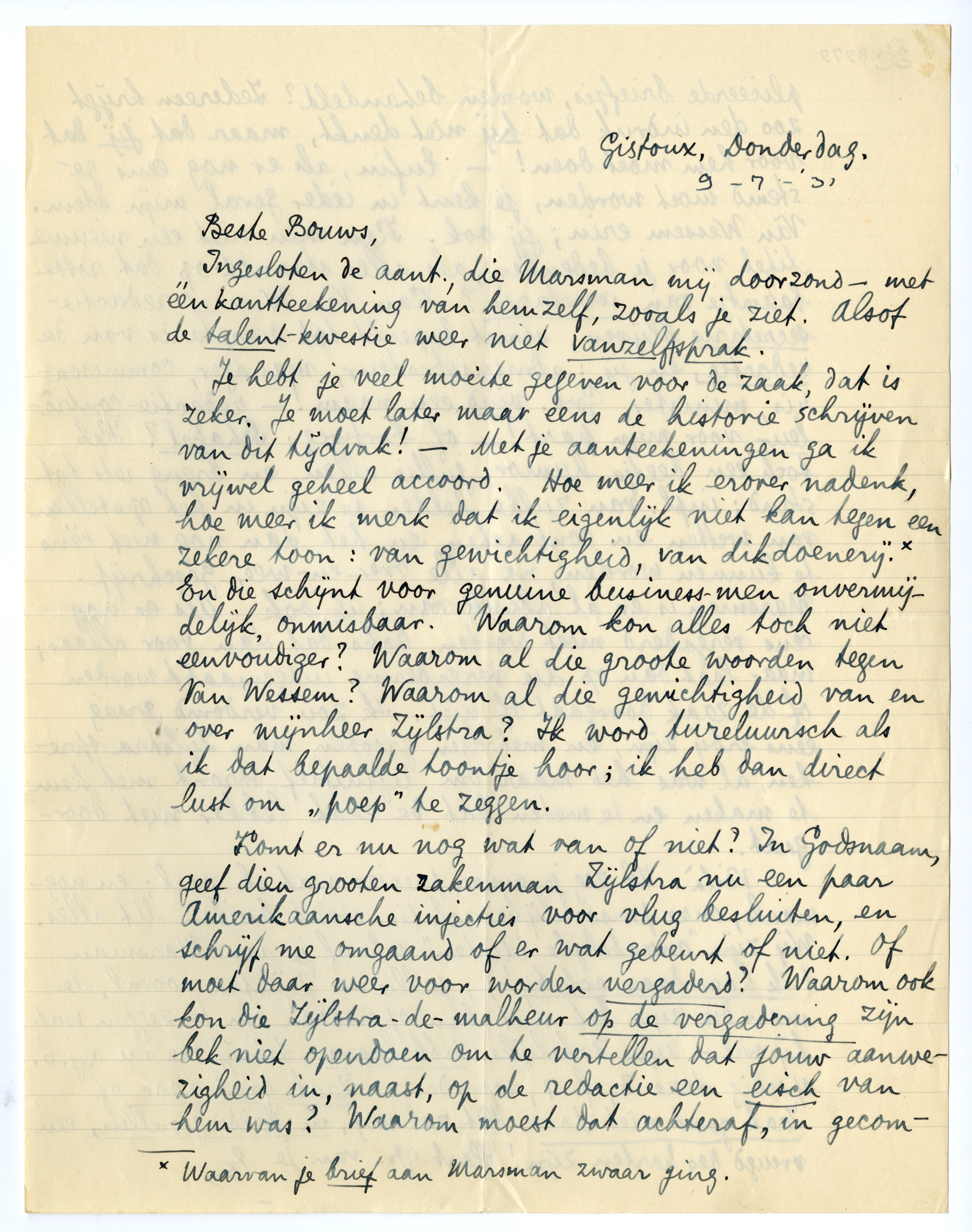 Ingesloten de aant., die Marsman mij doorzond - met één kantteekening van hemzelf, zooals je ziet. Alsof de talent-kwestie weer niet vanzelfsprak.