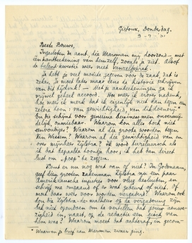 Je hebt je veel moeite gegeven voor de zaak, dat is zeker. Je moet later maar eens de historie schrijven van dit tijdvak! - Met je aanteekeningen ga ik vrijwel geheel accoord. Hoe meer ik erover nadenk, hoe meer ik merk dat ik eigenlijk niet kan tegen een zekere toon: van gewichtigheid, van dikdoenerij.* En die schijnt voor genuine business-men onvermijdelijk, onmisbaar. Waarom kon alles toch niet eenvoudiger? Waarom al die groote woorden tegen Van Wessem? Waarom al die gewichtigheid van en over mijnheer Zijlstra? Ik word tureluursch als ik dat bepaalde toontje hoor; ik heb dan direct lust om ‘poep’ te zeggen.