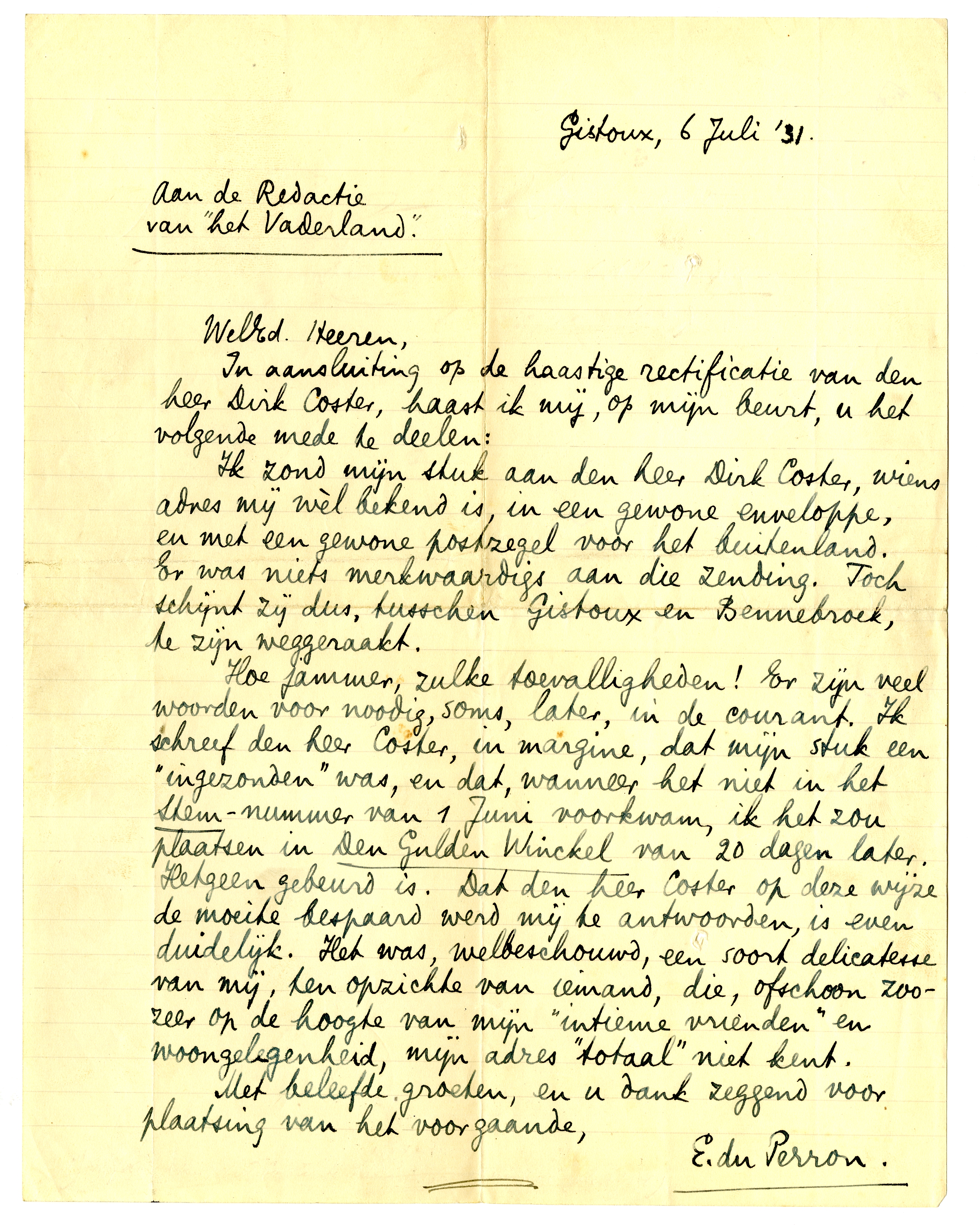 Ik zond mijn stuk aan den heer Dirk Coster, wiens adres mij wèl bekend is, in een gewone enveloppe, en met een gewone postzegel voor het buitenland. Er was niets merkwaardigs aan die zending. Toch schijnt zij dus, tusschen Gistoux en Bennebroek, te zijn weggeraakt.