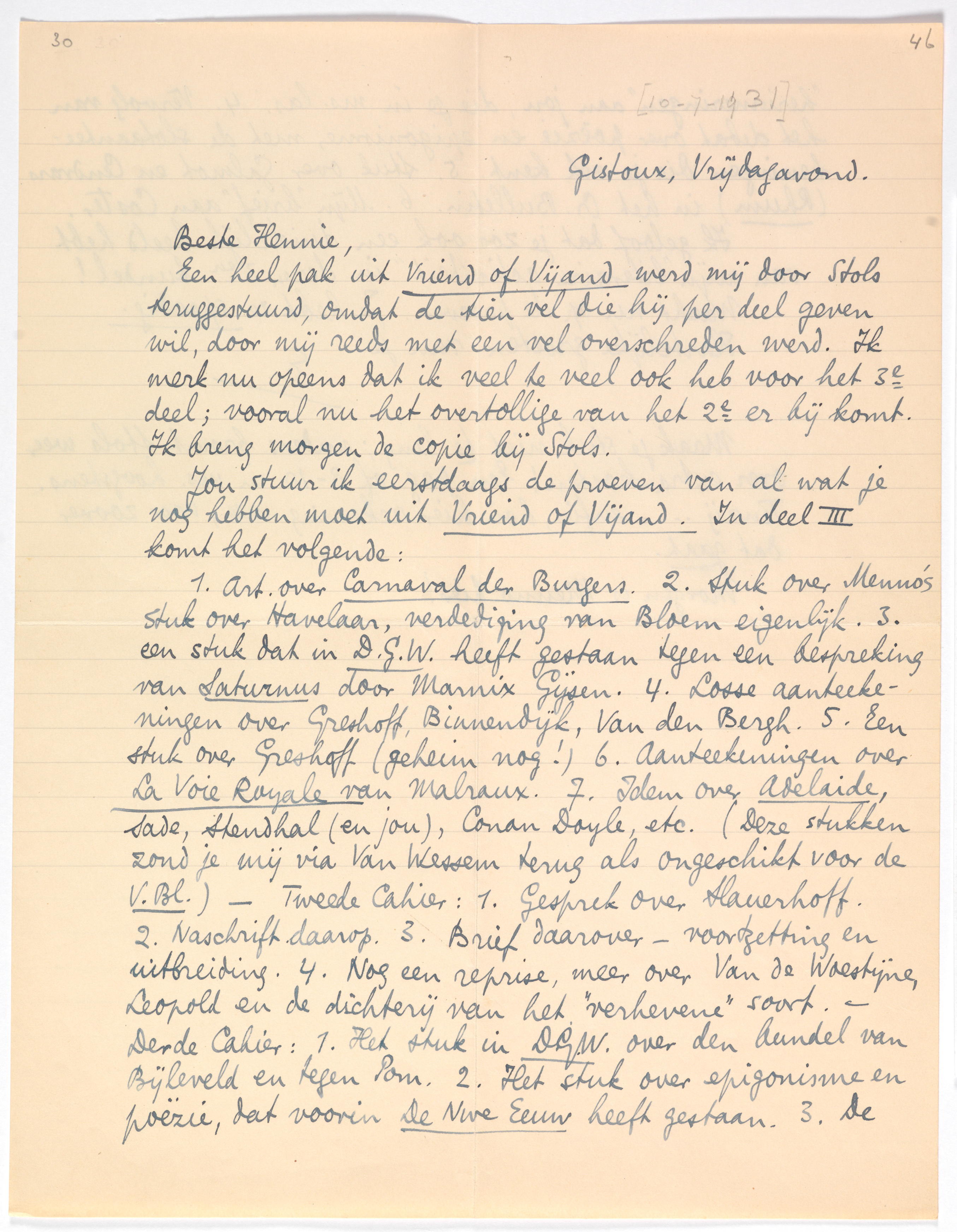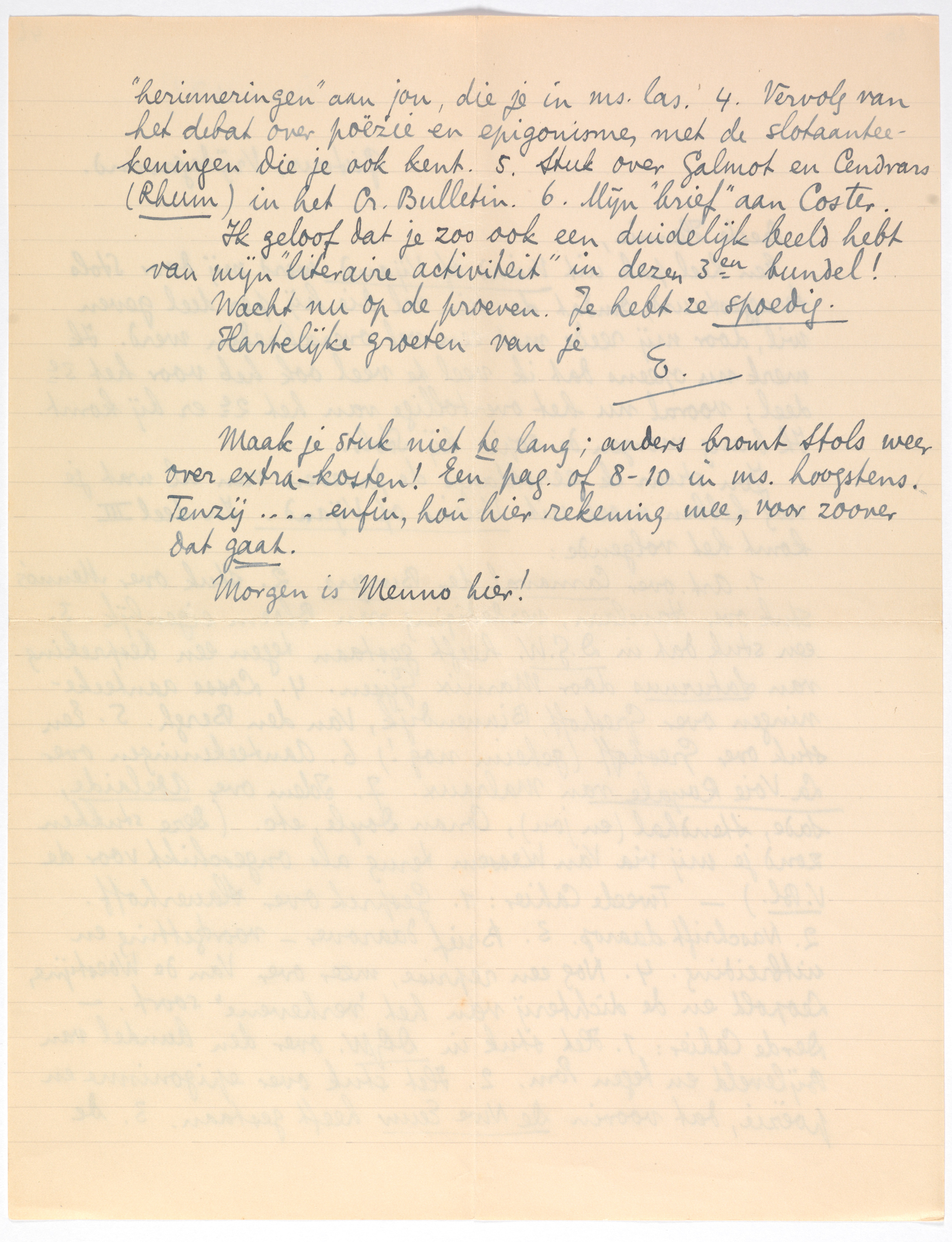 1. Art. over Carnaval der Burgers. 2. Stuk over Menno's stuk over Havelaar, verdediging van Bloem eigenlijk. 3. een stuk dat in D.G.W. heeft gestaan tegen een bespreking van Saturnus door Marnix Gijsen.1895 4. Losse aanteekeningen over Greshoff, Binnendijk, Van den Bergh. 5. Een stuk over Greshoff (geheim nog!) 6. Aanteekeningen over La Voie Royale van Malraux. 7. Idem over Adelaide, Sade, Stendhal (en jou), Conan Doyle, etc. (Deze stukken zond je mij via Van Wessem terug als ongeschikt voor de V.Bl.) - Tweede Cahier: 1. Gesprek over Slauerhoff. 2. Naschrift daarop. 3. Brief daarover - voortzetting en uitbreiding. 4. Nog een reprise, meer over Van de Woestijne, Leopold en de dichterij van het ‘verhevene’ soort. - Derde Cahier: 1. Het stuk in D.G.W. over den bundel van Bijleveld en tegen Pom. 2. Het stuk over epigonisme en poëzie, dat voorin De Nwe Eeuw heeft gestaan. 3. De ‘herinneringen’ aan jou, die je in ms. las. 4. Vervolg van het debat over poëzie en epigonisme, met de slotaanteekeningen die je ook kent. 5. Stuk over Galmot en Cendrars (Rhum) in het Cr. Bulletin. 6. Mijn ‘brief’ aan Coster.1896