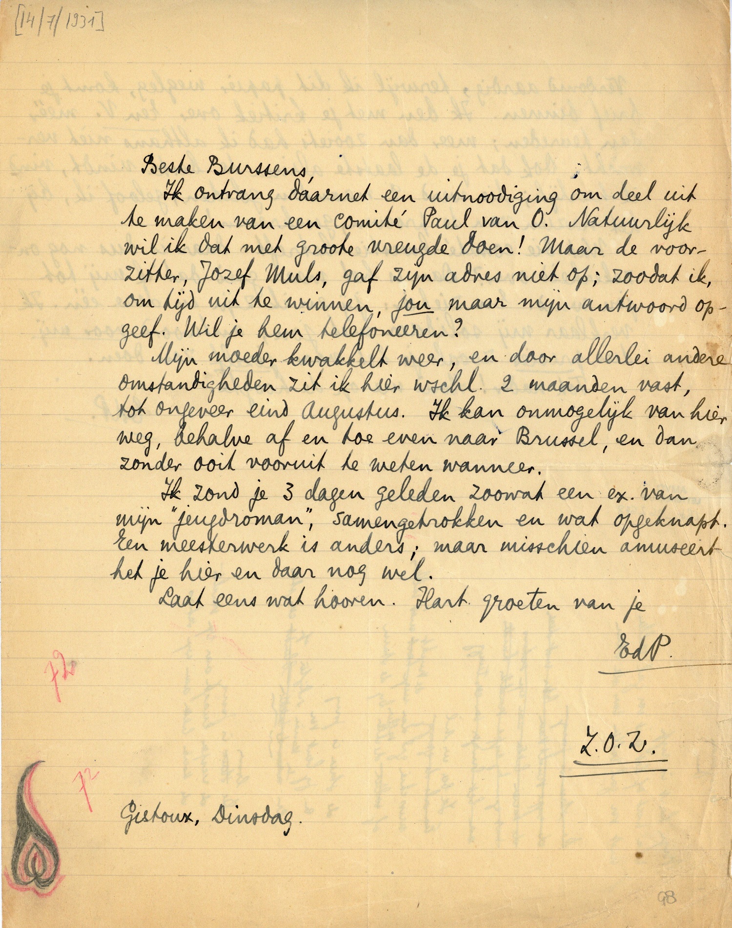Ik ontvang daarnet een uitnoodiging om deel uit te maken van een comité Paul van O. Natuurlijk wil ik dat met groote vreugde doen! Maar de voorzitter, Jozef Muls, gaf zijn adres niet op; zoodat ik, om tijd uit te winnen, jou maar mijn antwoord opgeef. Wil je hem telefoneeren?