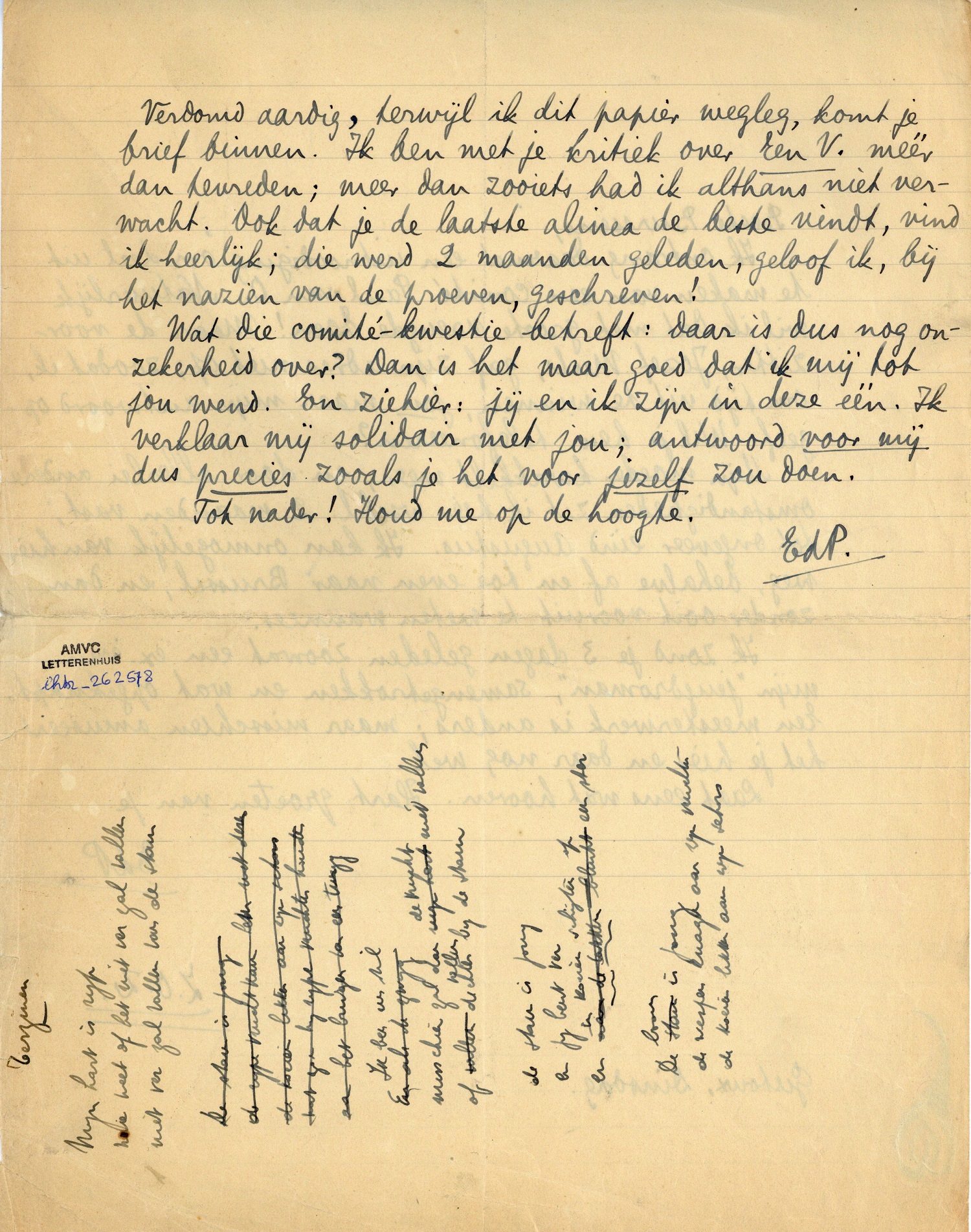 Verdomd aardig, terwijl ik dit papier wegleg, komt je brief binnen. Ik ben met je kritiek over Een V. méér dan tevreden; meer dan zooiets had ik althans niet verwacht. Ook dat je de laatste alinea de beste vindt, vind ik heerlijk; die werd 2 maanden geleden, geloof ik, bij het nazien van de proeven, geschreven!