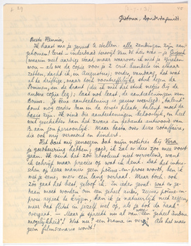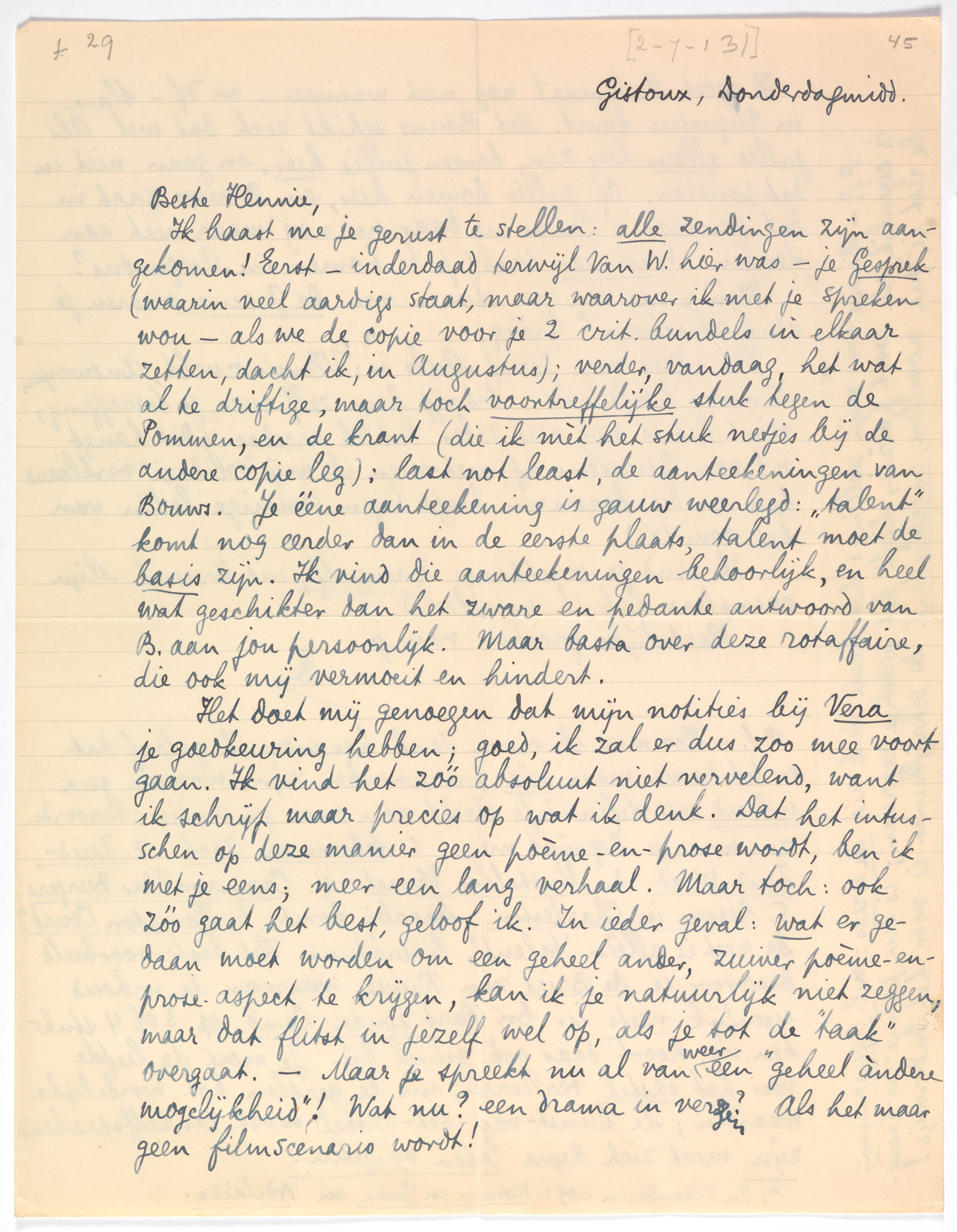 Het doet mij genoegen dat mijn notities bij Vera je goedkeuring hebben; goed, ik zal er dus zoo mee voort gaan. Ik vind het zóó absoluut niet vervelend, want ik schrijf maar precies op wat ik denk. Dat het intusschen op deze manier geen poème-en-prose wordt, ben ik met je eens; meer een lang verhaal. Maar toch: ook zóó gaat het best, geloof ik. In ieder geval: wat er gedaan moet worden om een geheel ander, zuiver poème-en-prose-aspect te krijgen, kan ik je natuurlijk niet zeggen, maar dat flitst in jezelf wel op, als je tot de ‘taak’ overgaat. - Maar je spreekt nu al van weer een ‘geheel àndere mogelijkheid’! Wat nu? een drama in verzen? Als het maar geen filmscenario wordt!