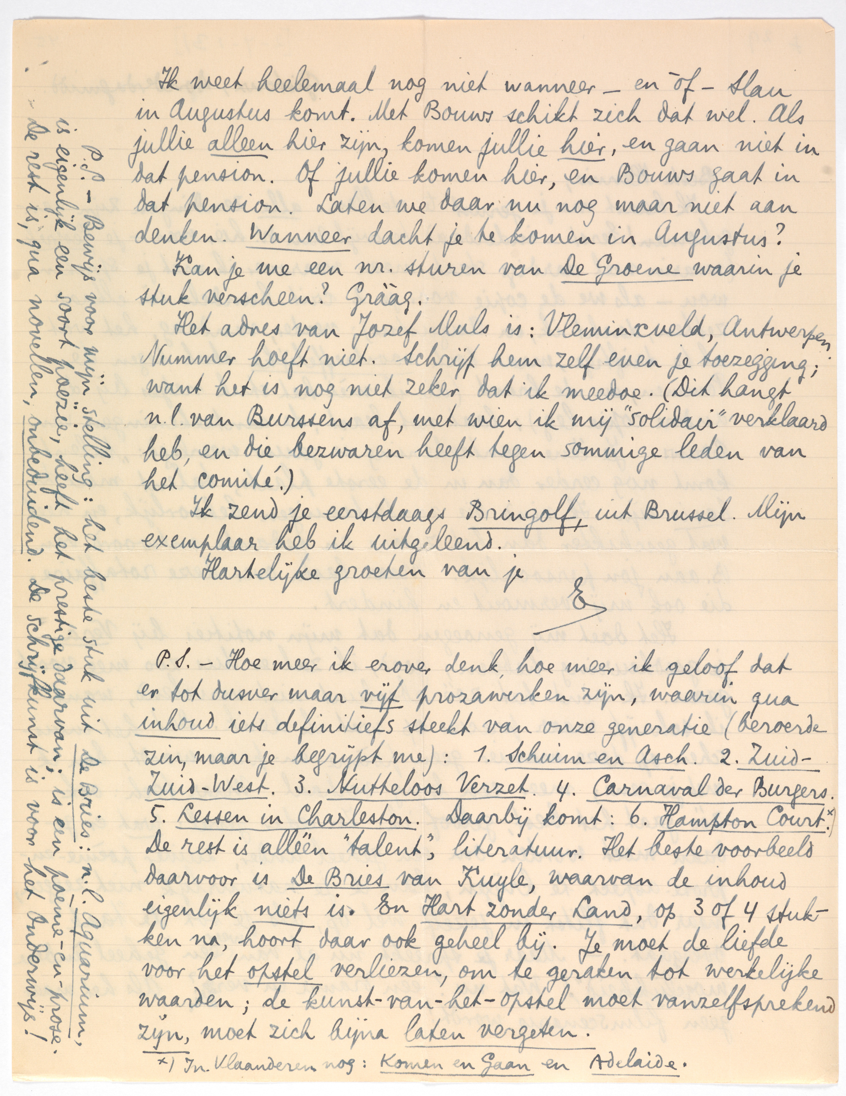 P.S. - Hoe meer ik erover denk, hoe meer ik geloof dat er tot dusver maar vijf prozawerken zijn, waarin qua inhoud iets definitiefs steekt van onze generatie (beroerde zin, maar je begrijpt me): 1. Schuim en Asch. 2. Zuid-Zuid-West. 3. Nutteloos Verzet. 4. Carnaval der Burgers. 5. Lessen in Charleston. Daarbij komt: 6. Hampton Court.* De rest is al-léén ‘talent’, literatuur. Het beste voorbeeld daarvoor is De Bries van Kuyle, waarvan de inhoud eigenlijk niets is. En Hart zonder Land, op 3 of 4 stukken na, hoort daar ook geheel bij. Je moet de liefde voor het opstel verliezen, om te geraken tot werkelijke waarden; de kunst-van-het-opstel moet vanzelfsprekend zijn, moet zich bijna laten vergeten.