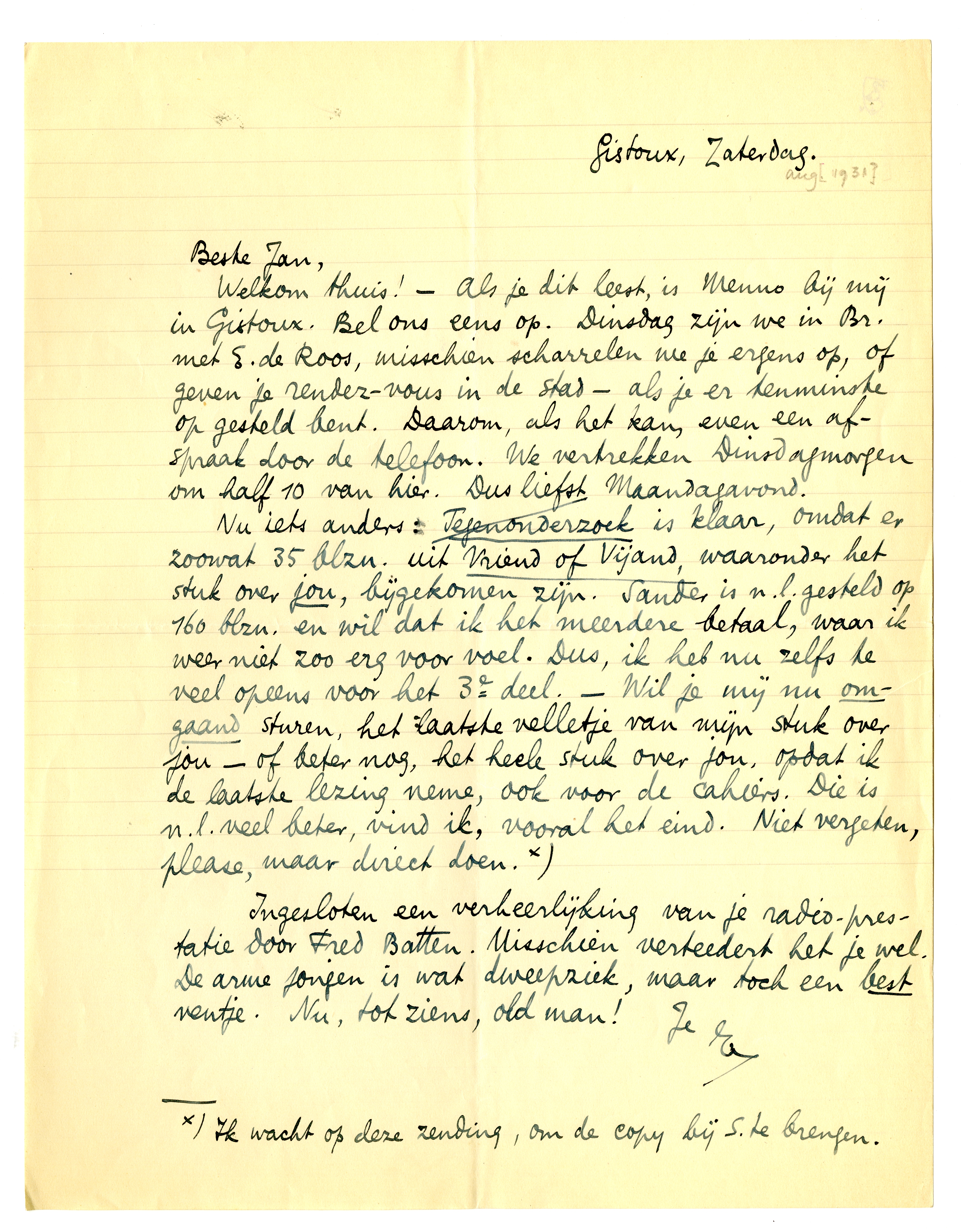 Nu iets anders: Tegenonderzoek is klaar, omdat er zoowat 35 blzn. uit Vriend of Vijand, waaronder het stuk over jou, bijgekomen zijn. Sander is n.l. gesteld op 160 blzn. en wil dat ik het meerdere betaal, waar ik weer niet zoo erg voor voel. Dus, ik heb nu zelfs te veel opeens voor het 3e deel. - Wil je mij nu omgaand sturen, het laatste velletje van mijn stuk over jou - of beter nog, het heele stuk over jou, opdat ik de laatste lezing neme, ook voor de cahiers. Die is n.l. veel beter, vind ik, vooral het eind. Niet vergeten, please, maar direct doen.*