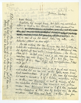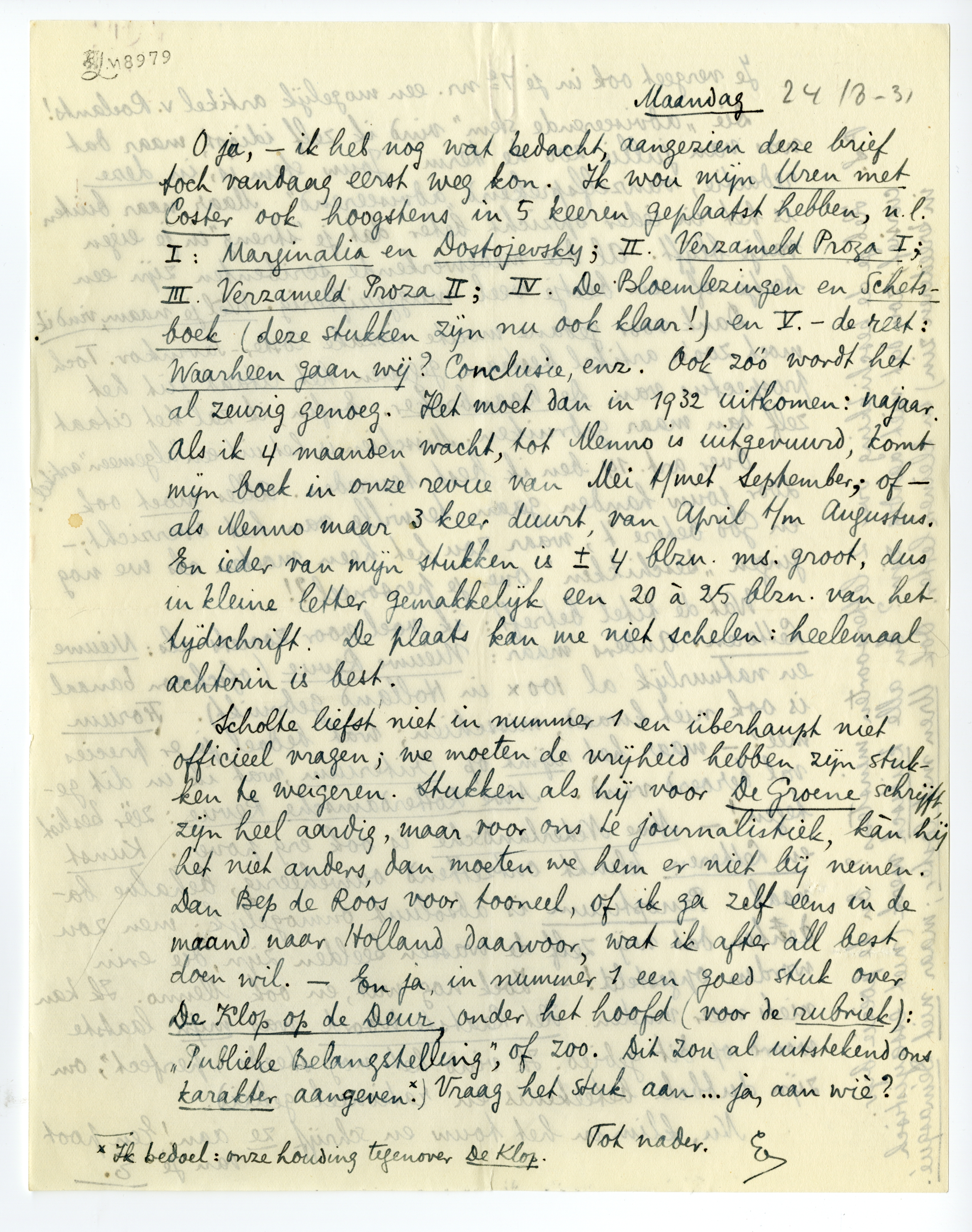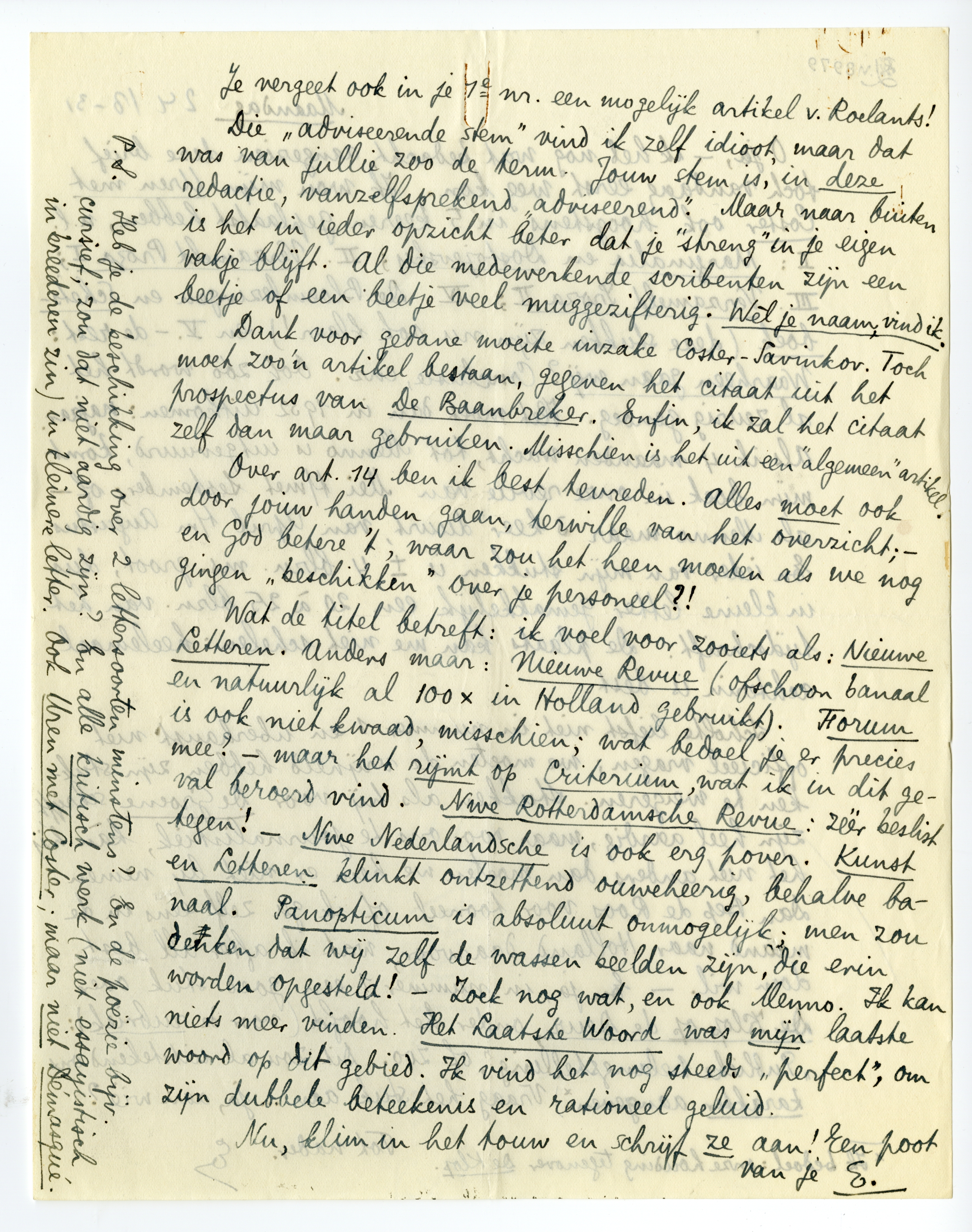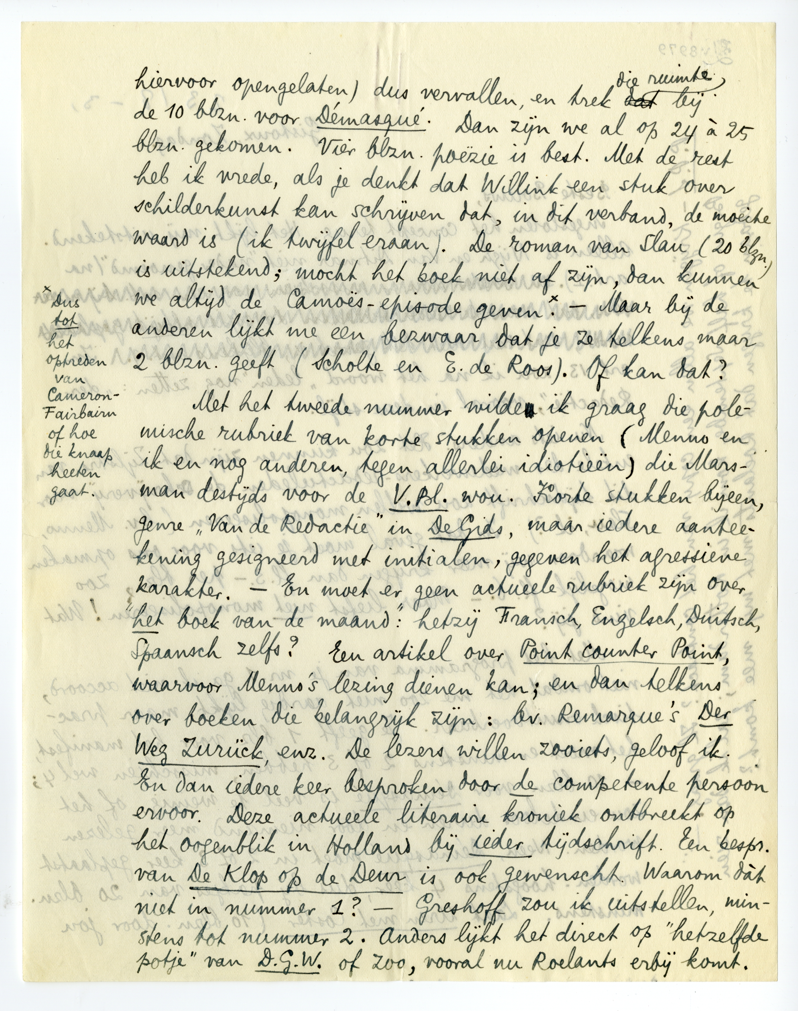 Met het tweede nummer wilde ik graag die polemische rubriek van korte stukken openen (Menno en ik en nog anderen, tegen allerlei idiotieën) die Marsman destijds voor de V.Bl. wou. Korte stukken bijeen, genre ‘Van de Redactie’ in De Gids, maar iedere aanteekening gesigneerd met initialen, gegeven het agressieve karakter. - En moet er geen actueele rubriek zijn over ‘het boek van de maand’: hetzij Fransch, Engelsch, Duitsch, Spaansch zelfs? Een artikel over Point counter Point, waarvoor Menno's lezing dienen kan; en dan telkens over boeken die belangrijk zijn: bv. Remarque's Der Weg Zurück, enz. De lezers willen zooiets, geloof ik. En dan iedere keer besproken door de competente persoon ervoor. Deze actueele literaire kroniek ontbreekt op het oogenblik in Holland bij ieder tijdschrift. Een bespr. van De Klop op de Deur is ook gewenscht. Waarom dàt niet in nummer 1? - Greshoff zou ik uitstellen, minstens tot nummer 2. Anders lijkt het direct op ‘hetzelfde potje’ van D.G.W. of zoo, vooral nu Roelants erbij komt. Je vergeet ook in je 1e nr. een mogelijk artikel v. Roelants! Die ‘adviseerende stem’ vind ik zelf idioot, maar dat was van jullie zoo de term. Jouw stem is, in deze redactie, vanzelfsprekend ‘adviseerend’. Maar naar buiten is het in ieder opzicht beter dat je ‘streng’ in je eigen vakje blijft. Al die medewerkende scribenten zijn een beetje of een beetje veel muggezifterig. Wel je naam, vind ik.