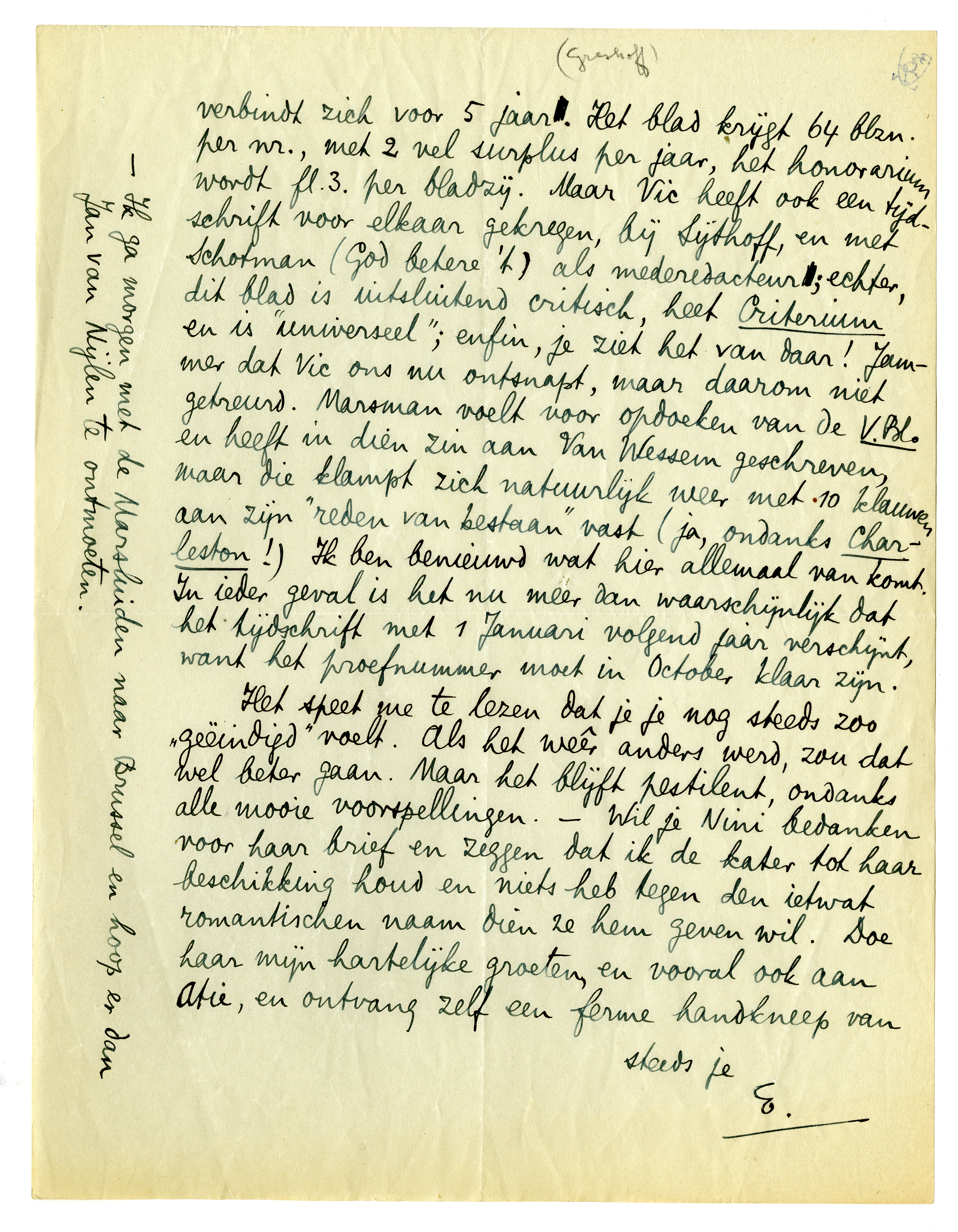 Ik heb overigens toch geen lust meer het naar juffrouw Manteau te zenden: 1o. heb ik het nog steeds noodig; 2o. zal ik je het ms. begin September geven of het joù naar St. Idesbald opsturen, als ik eerder klaar ben, zoodat jij het mij begin Sept. terug kunt geven als ik naar Holland ga; 3o komt het in het nieuwe tijdschrift, dat ditmaal zoo goed als voor elkaar is, met Menno, mij en Maurice Roelants in de redactie en Bouws als secretaris van idem. En ‘kantoor’ ten gebouwe van Nijgh en Van Ditmar! Ik zond vanmorgen het concept-contract terug: men verbindt zich voor 5 jaar. Het blad krijgt 64 blzn. per nr., met 2 vel surplus per jaar, het honorarium wordt fl.3. per bladzij. Maar Vic heeft ook een tijdschrift voor elkaar gekregen, bij Sijthoff, en met Schotman (God betere 't) als mederedacteur; echter, dit blad is uitsluitend critisch, heet Criterium en is ‘universeel’; enfin, je ziet het van daar! Jammer dat Vic ons nu ontsnapt, maar daarom niet getreurd. Marsman voelt voor opdoeken van de V.Bl. en heeft in dien zin aan Van Wessem geschreven, maar die klampt zich natuurlijk weer met 10 klauwen aan zijn ‘reden van bestaan’ vast (ja, ondanks Charleston!) Ik ben benieuwd wat hier allemaal van komt. In ieder geval is het nu meer dan waarschijnlijk dat het tijdschrift met 1 Januari volgend jaar verschijnt, want het proefnummer moet in October klaar zijn.