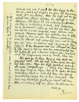 Je hebt de hartelijke groeten terug van de Marslieden, die nu in het pension Bon Accueil gekropen zijn. Mijn moeder verlangde wel zéér naar rust! - Coster is, ondanks alle bezoeken, op een oor na gevild; 167 blzn. liggen klaar, nog een stuk of 10 en het finis kan eronder staan. Èn Menno (die het maar tot blz. 115 zoowat kon volgen) èn Marsman vinden het moordend. In ieder geval zal men hierna niet meer zwammen over de onvoldoende bestudeering; het regent citaten, en de titel van Elisabeth de Roos; Uren met Dirk Coster, is werkelijk perfect.