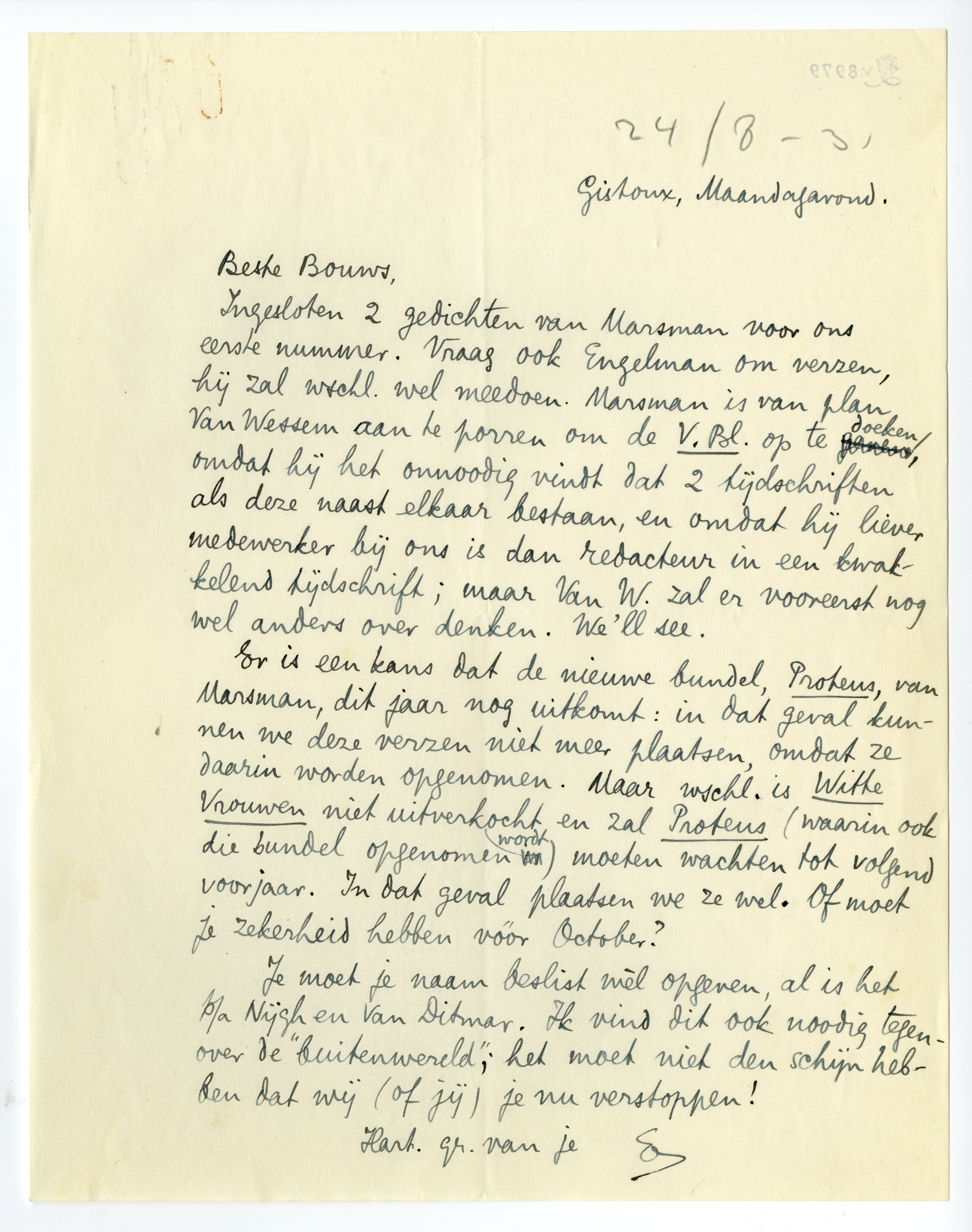 Ingesloten 2 gedichten van Marsman1955 voor ons eerste nummer. Vraag ook Engelman om verzen, hij zal wschl. wel meedoen. Marsman is van plan Van Wessem aan te porren om de V. Bl. op te doeken, omdat hij het onnoodig vindt dat 2 tijdschriften als deze naast elkaar bestaan, en omdat hij liever medewerker bij ons is dan redacteur in een kwakkelend tijdschrift; maar Van W. zal er vooreerst nog wel anders over denken. We'll see.