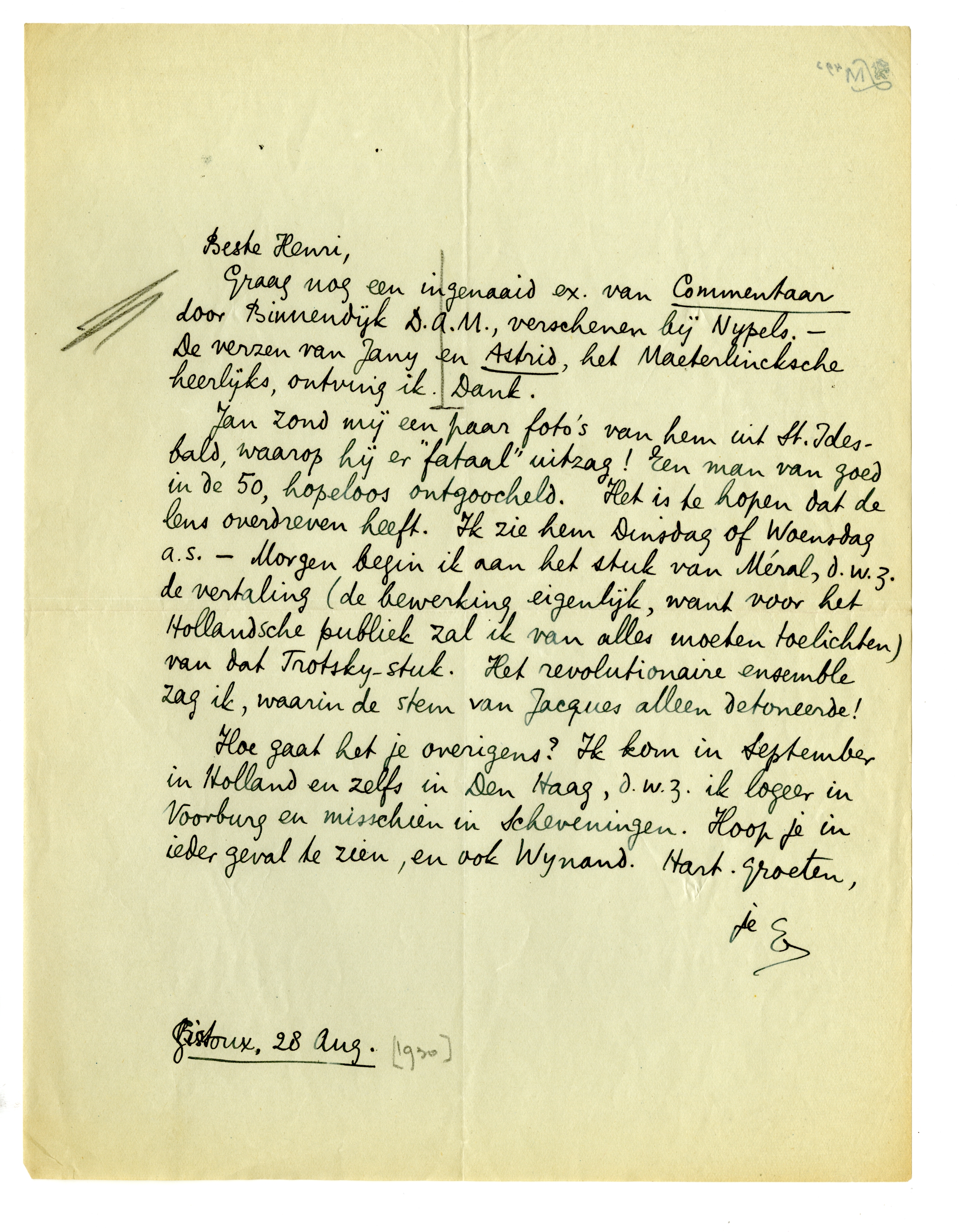 Graag nog een ingenaaid ex. van Commentaar door Binnendijk D.A.M., verschenen bij Nypels. - De verzen van Jany en Astrid, het Maeterlincksche heerlijks, ontving ik. Dank.