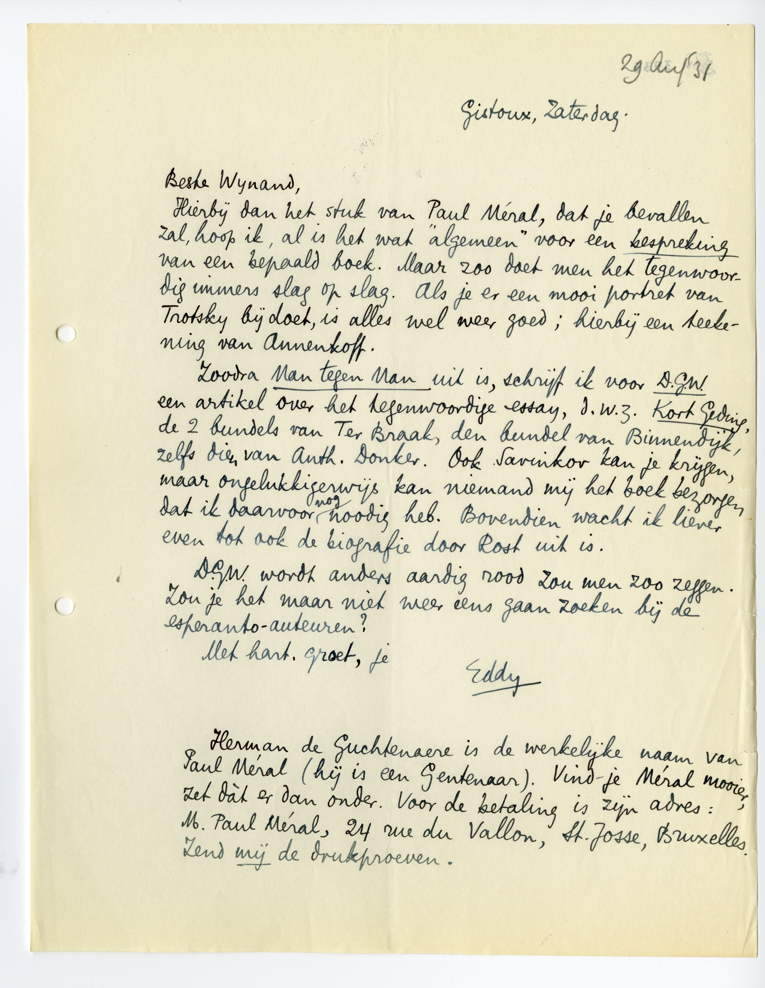Herman de Guchtenaere is de werkelijke naam van Paul Méral (hij is een Gentenaar). Vind-je Méral mooier, zet dàt er dan onder. Voor de betaling is zijn adres: M. Paul Méral, 24 rue du Vallon, St. Josse, Bruxelles. Zend mij de drukproeven.