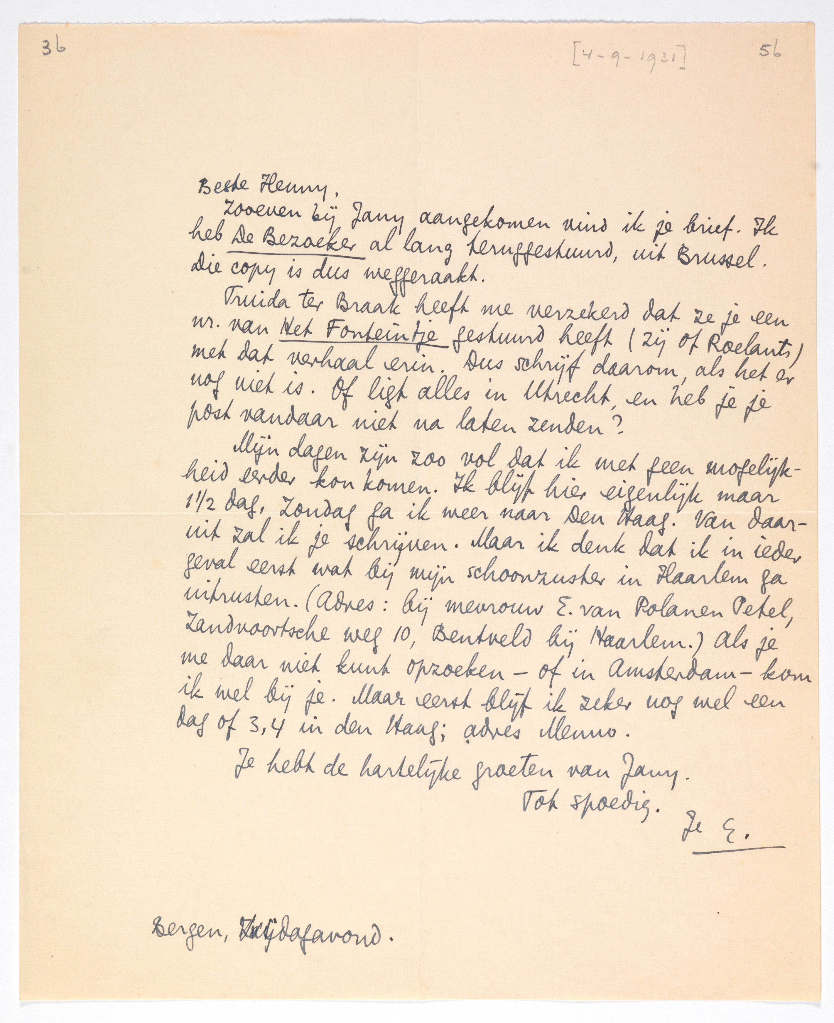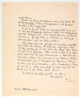 Mijn dagen zijn zoo vol dat ik met geen mogelijkheid eerder kon komen. Ik blijf hier eigenlijk maar 1½ dag, Zondag ga ik weer naar Den Haag. Van daaruit zal ik je schrijven. Maar ik denk dat ik in ieder geval eerst wat bij mijn schoonzuster in Haarlem ga uitrusten. (Adres: bij mevrouw E. van Polanen Petel, Zandvoortsche weg 10, Bentveld bij Haarlem.) Als je me daar niet kunt opzoeken - of in Amsterdam - kom ik wel bij je. Maar eerst blijf ik zeker nog wel een dag of 3, 4 in den Haag; adres Menno.
