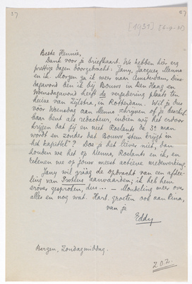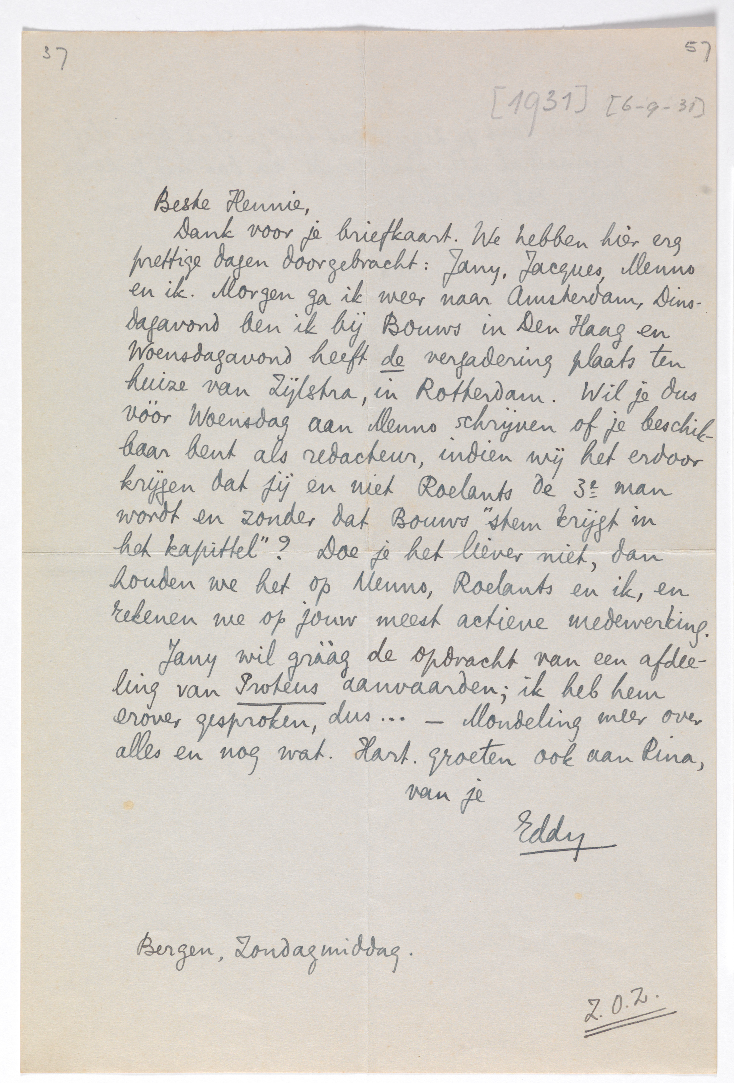 Dank voor je briefkaart. We hebben hier erg prettige dagen doorgebracht: Jany, Jacques, Menno en ik. Morgen ga ik weer naar Amsterdam, Dinsdagavond ben ik bij Bouws in Den Haag en Woensdagavond heeft de vergadering plaats ten huize van Zijlstra, in Rotterdam. Wil je dus vóór Woensdag aan Menno schrijven of je beschikbaar bent als redacteur, indien wij het erdoor krijgen dat jij en niet Roelants de 3e man wordt en zonder dat Bouws ‘stem krijgt in het kapittel’? Doe je het liever niet, dan houden we het op Menno, Roelants en ik, en rekenen we op jouw meest actieve medewerking.