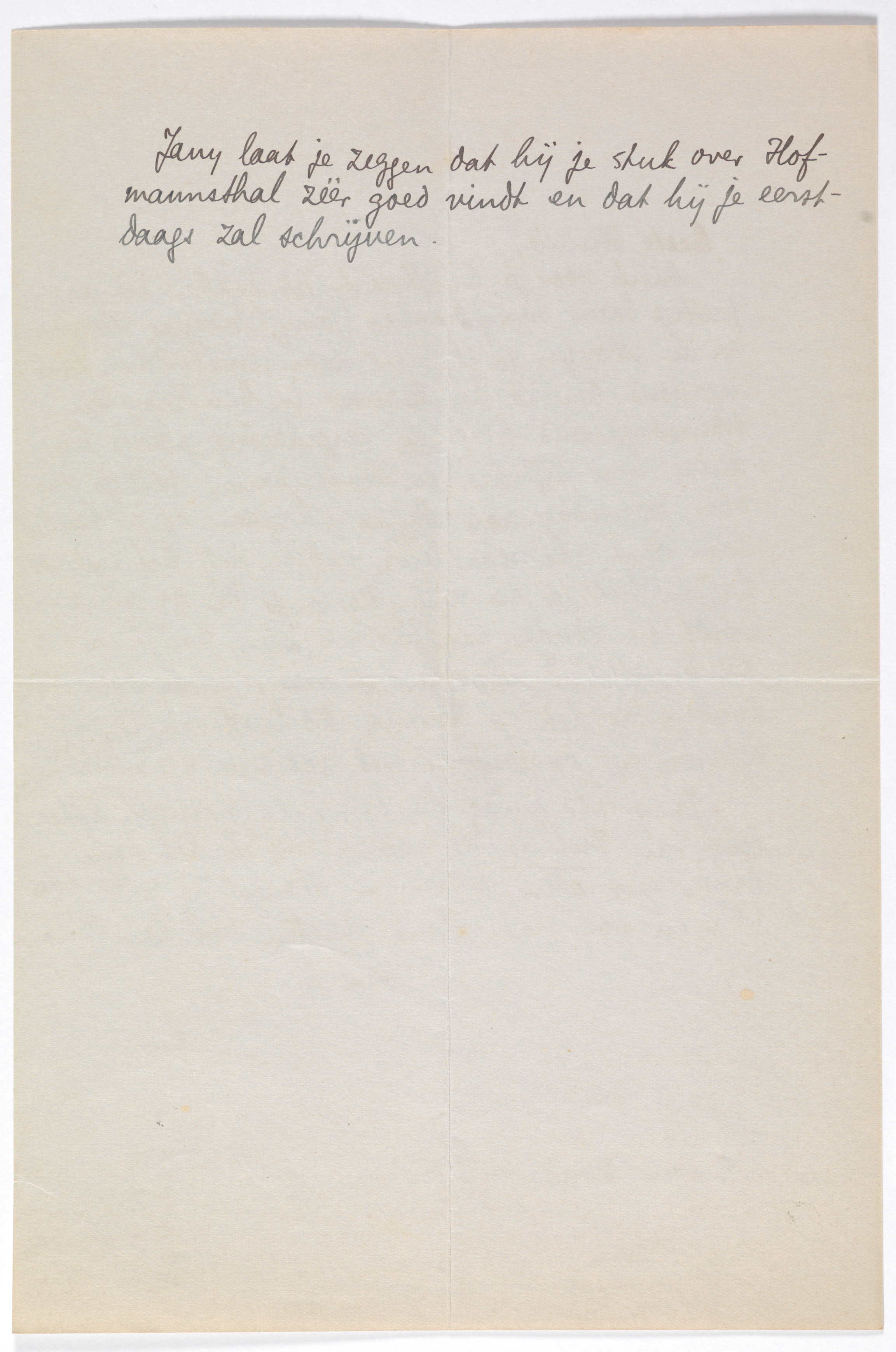 Jany laat je zeggen dat hij je stuk over Hofmannsthal1973 zéér goed vindt en dat hij je eerstdaags zal schrijven.