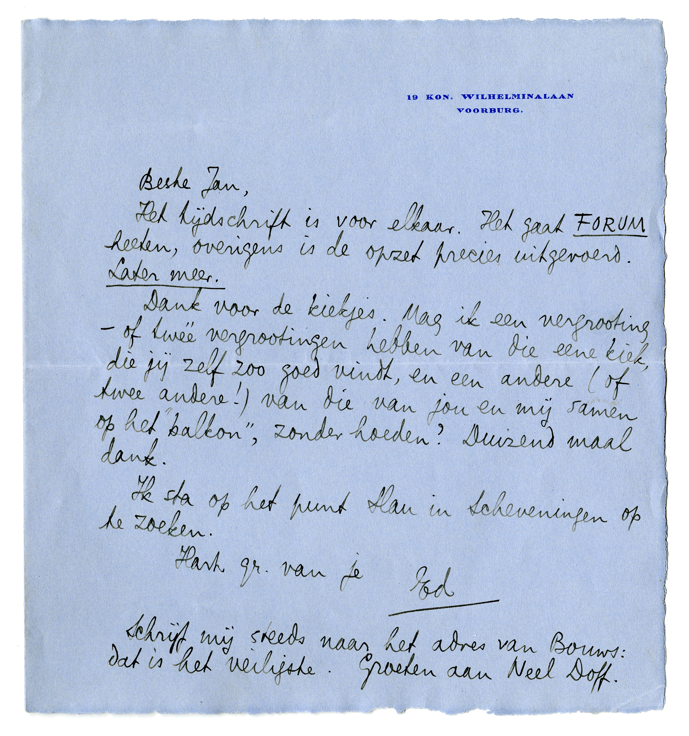 Dank voor de kiekjes. Mag ik een vergrooting - of twéé vergrootingen hebben van die eene kiek, die jij zelf zoo goed vindt, en een andere (of twee andere!) van die van jou en mij samen op het ‘balkon’, zonder hoeden? Duizend maal dank.