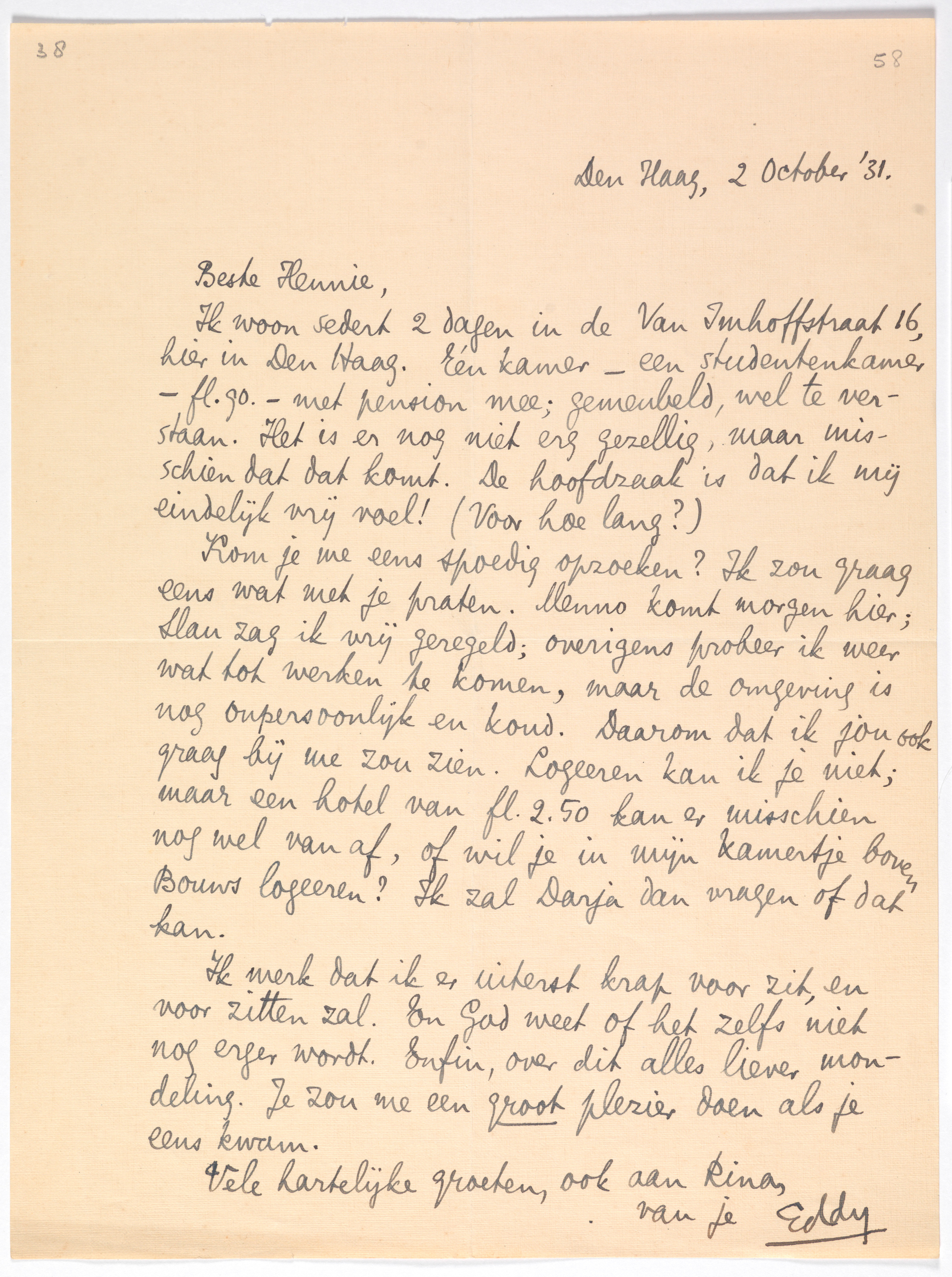 Ik woon sedert 2 dagen in de Van Imhoffstraat 16, hier in Den Haag. Eén kamer - een studentenkamer - fl.90 -met pension mee; gemeubeld, wel te verstaan. Het is er nog niet erg gezellig, maar misschien dat dat komt. De hoofdzaak is dat ik mij eindelijk vrij voel! (Voor hoe lang?)