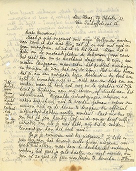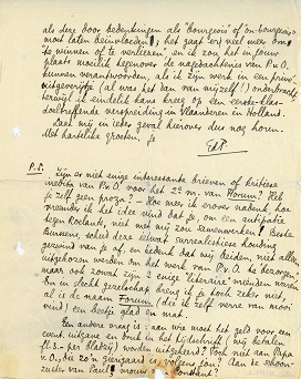 Maak je niet ongerust over mijn ‘Hollander’ worden; voor zover ik het niet bèn, zal ik er ook wel niet in gaan veranderen, al zit ik in dit land. Maar het is beter om de omstandigheden te beheersen (voor zover dat gaat) dan om er wrokkend dupe van te zijn; we moeten langzaam maar zeker het publiek overtuigen en dwingen te zien dat wij er zijn. Het is dus dwaas dat je, om een antipatie tegen Roelants - die toch werkelik de kwaadste niet is - niet aan een blad zou meewerken, waar ik toch ook nog in de redaktie zit?* Je kunt je bijdragen aan mij sturen, of direkt aan het sekretariaat. Bepaalde uitnodigingen schijnen, na nadere bespreking, niet te worden gedaan: expres om mensen niet op de tenen te trappen die officieel uitgenodigd hadden moeten worden! Laat ons dus zeggen dat ik jou hierbij (of in de vorige brief zelfs) uitnodig om, als je wat hebt, mij dit te zenden. Eenvoudiger kan het toch niet?