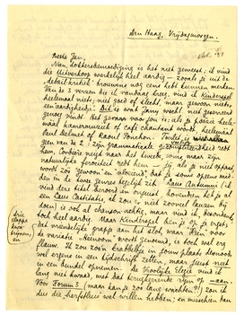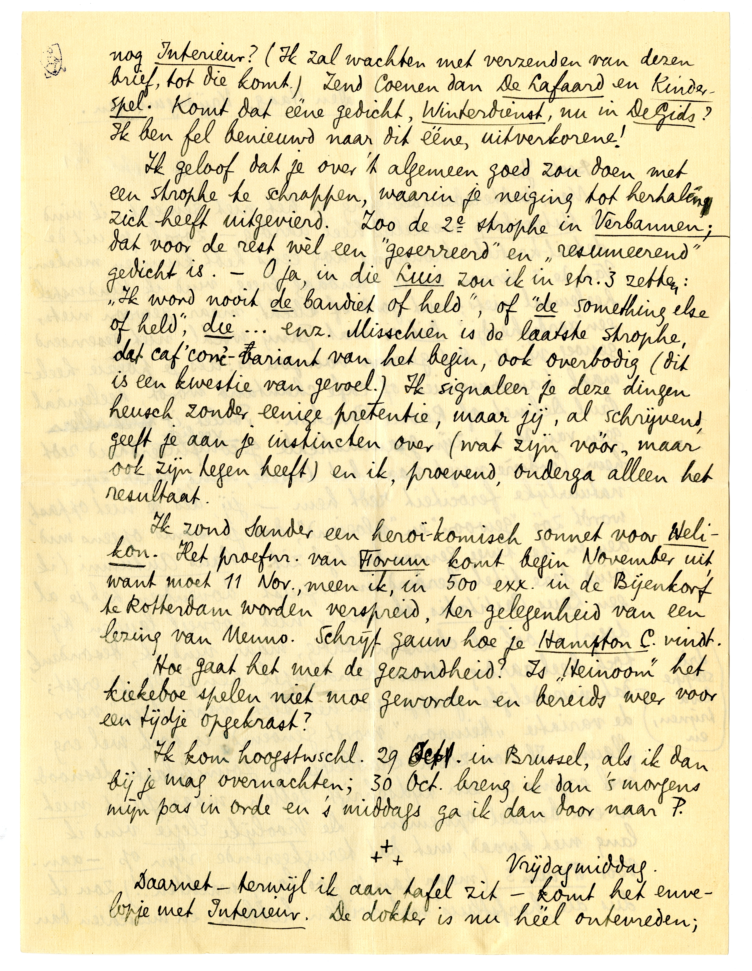 Ik zond Sander een heroï-komisch sonnet voor Helikon. Het proefnr. van Forum komt begin November uit, want moet 11 Nov., meen ik, in 500 exx. in de Bijenkorf te Rotterdam worden verspreid, ter gelegenheid van een lezing van Menno. Schrijf gauw hoe je Hampton C. vindt.