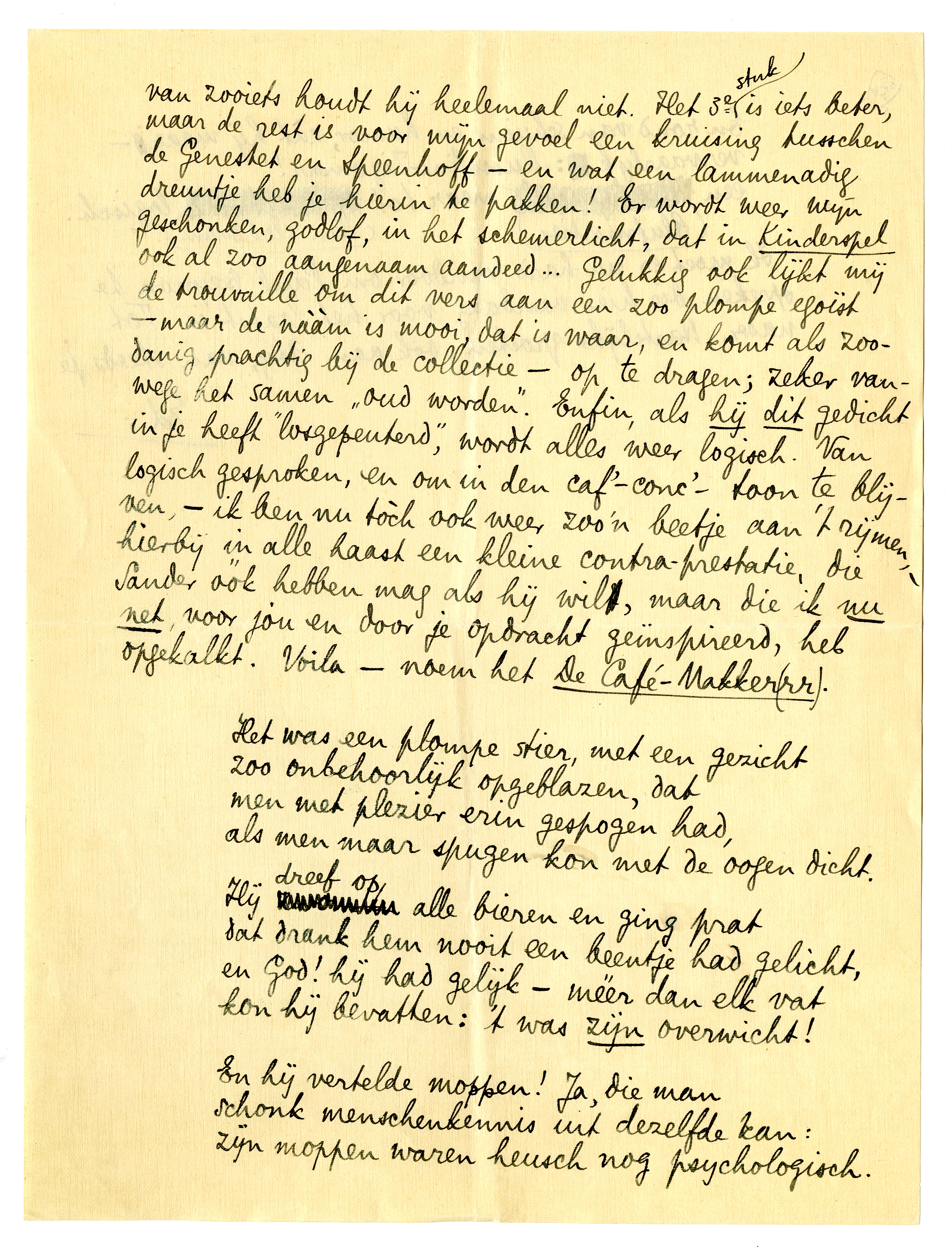 Daarnet - terwijl ik aan tafel zit - komt het envelopje met Interieur. De dokter is nu héél ontevreden; van zooiets houdt hij heelemaal niet. Het 3e stuk is iets beter, maar de rest is voor mijn gevoel een kruising tusschen de Genestet en Speenhoff - en wat een lammenadig dreuntje heb je hierin te pakken! Er wordt weer wijn geschonken, godlof, in het schemerlicht, dat in Kinderspel ook al zoo aangenaam aandeed... Gelukkig ook lijkt mij de trouvaille om dit vers aan een zoo plompe egoïst2011 - maar de nààm is mooi, dat is waar, en komt als zoodanig prachtig bij de collectie - op te dragen; zeker vanwege het samen ‘oud worden’. Enfin, als hij dit gedicht in je heeft ‘losgepeuterd’, wordt alles weer logisch. Van logisch gesproken, en om in den caf'-conc'-toon te blijven, - ik ben nu tòch ook weer zoo'n beetje aan 't rijmen, - hierbij in alle haast een kleine contraprestatie, die Sander óók hebben mag als hij wil, maar die ik nu net, voor jou en door je opdracht geïnspireerd, heb opgekalkt. Voila - noem het De Café-Makker(rr).2012